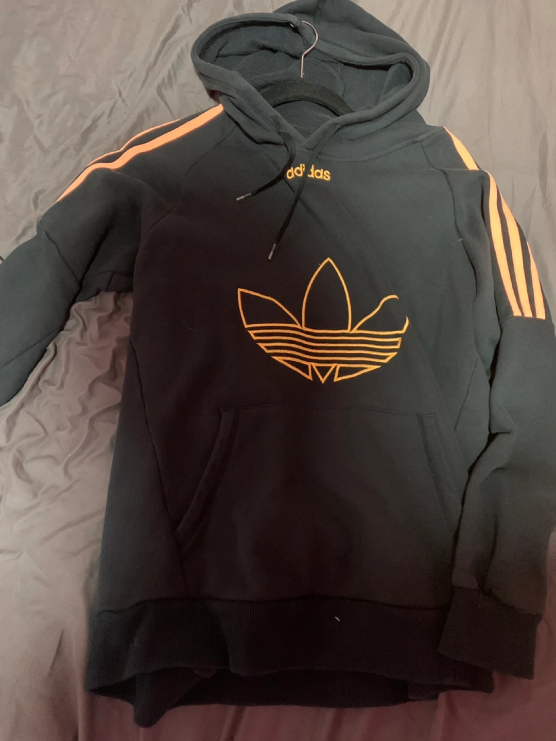 Selling a gently used Adidas hoodie. It's black with orange stripes on the sleeves and an orange Adidas logo on the front. It's a comfy hoodie, perfect for everyday wear!