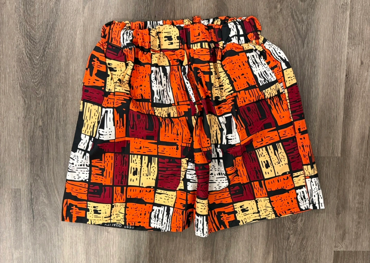These shorts feature a vibrant and unique pattern with orange, white, yellow, and black colours. The drawstring waist ensures a comfortable and adjustable fit. Perfect for casual wear!