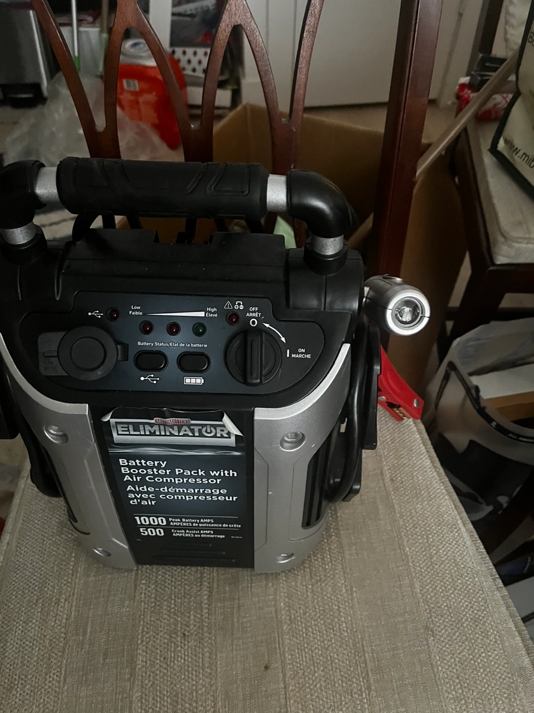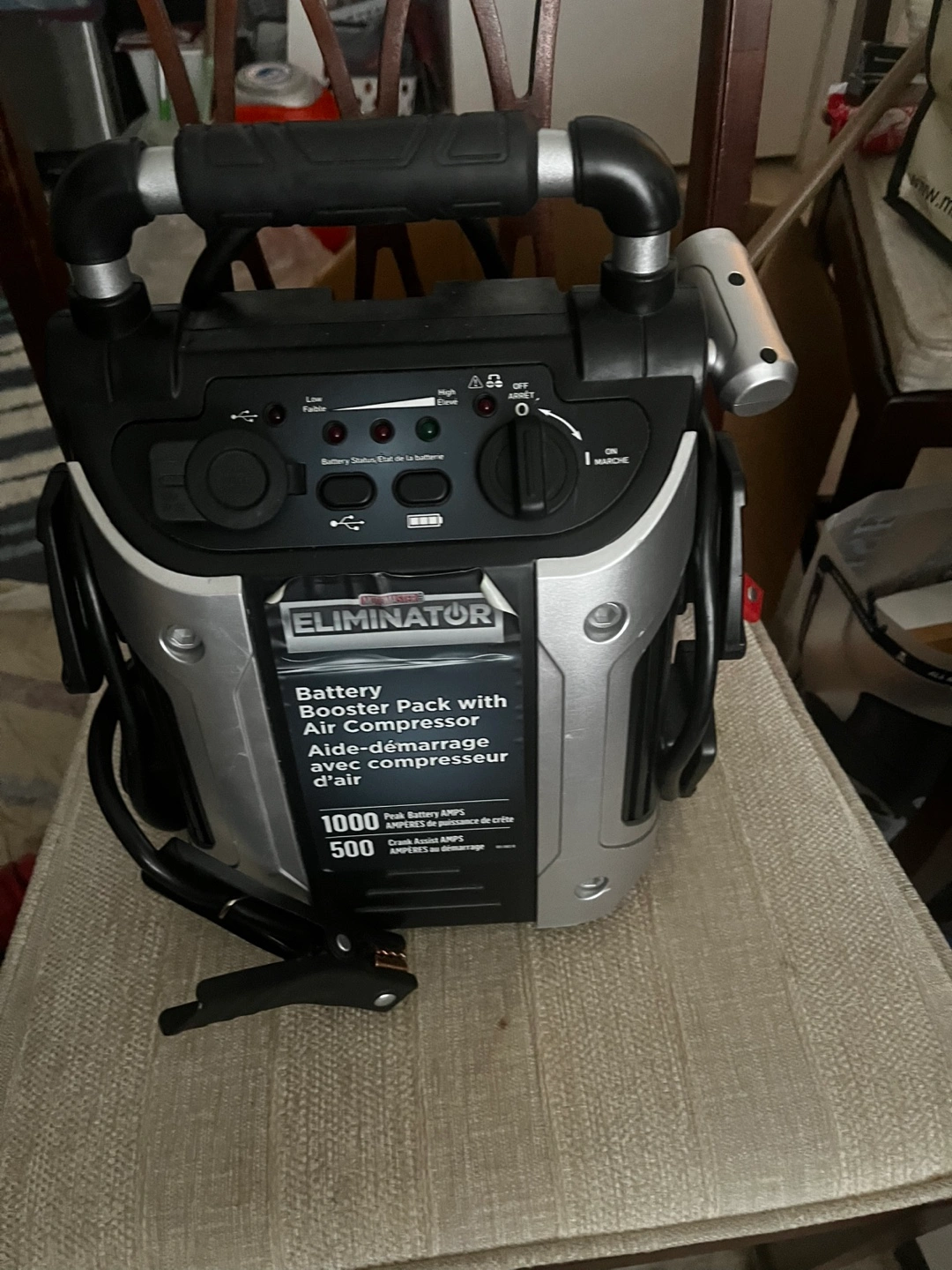 Selling an Eliminator Battery Booster Pack with Air Compressor! It has 1000 Peak Battery Amps and 500 Amps at 0 seconds. Perfect for those winter months!