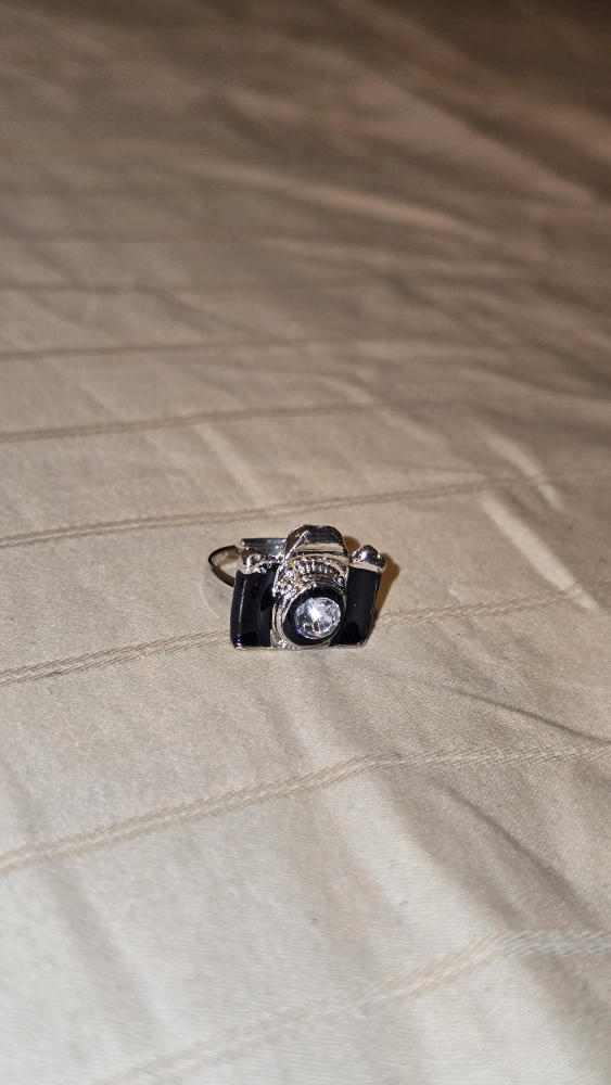 A cute camera ring, perfect for photographers or anyone who loves a unique accessory! It's black and silver and in great condition