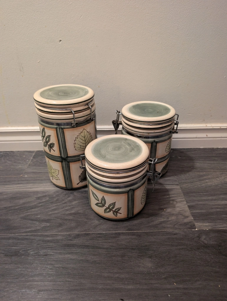 I'm selling a set of three ceramic canisters. They feature a lovely leaf design. Perfect for adding a touch of nature to your kitchen decor! They're in great shape and ready for a new home
