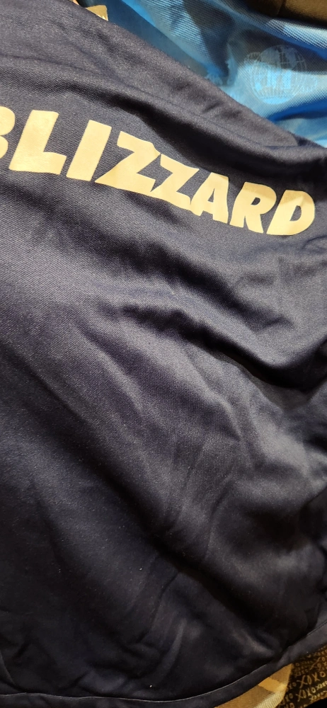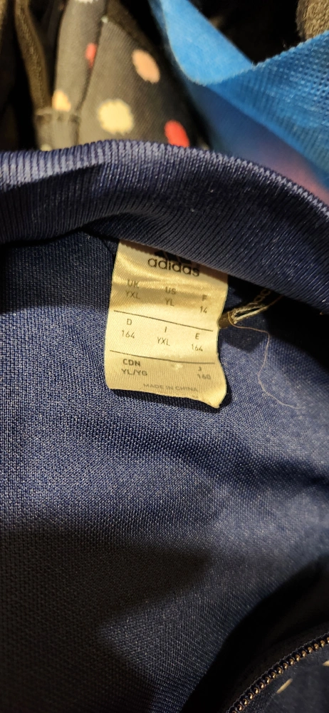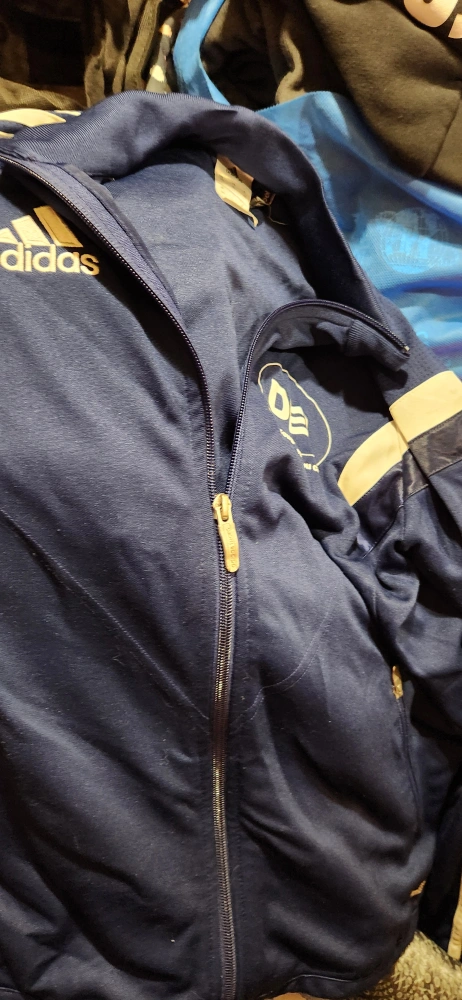 Selling an Adidas track jacket, size YXL (youth extra large). It's a navy blue colour with the word "Blizzard" on the back. Perfect for sports or casual wear!