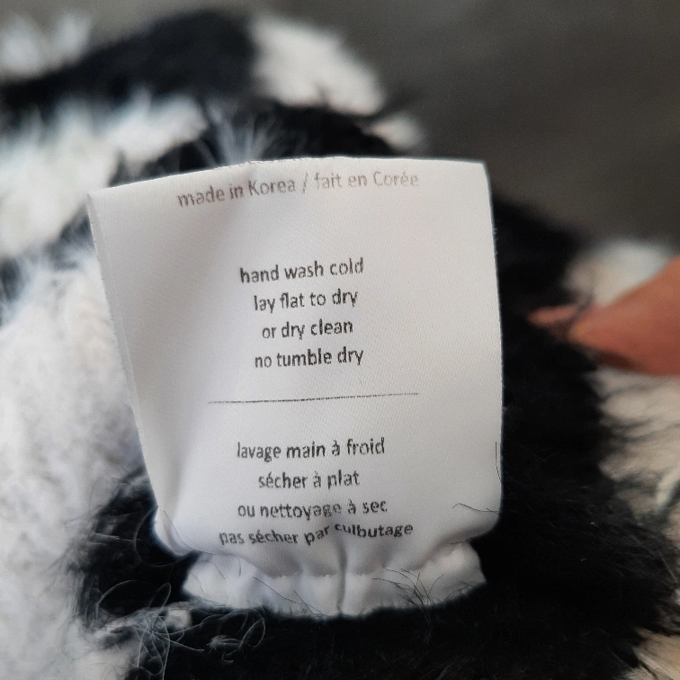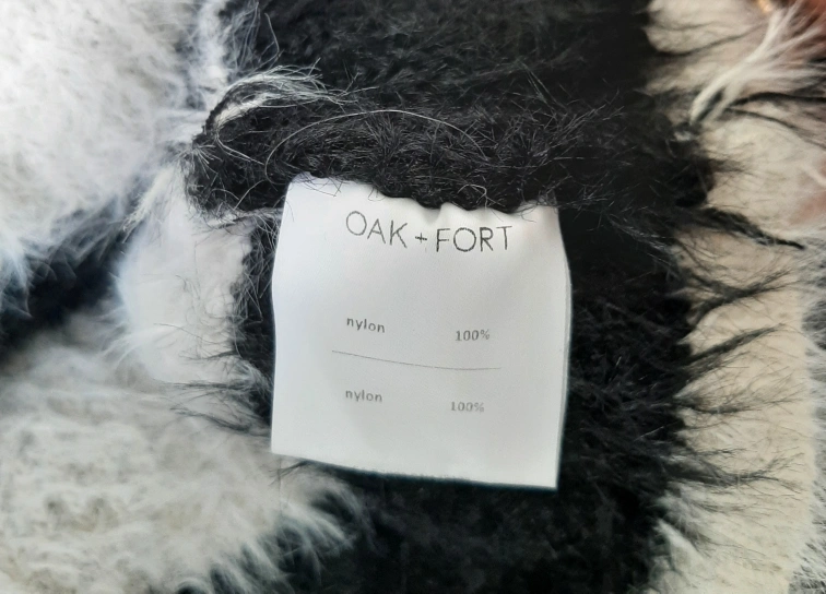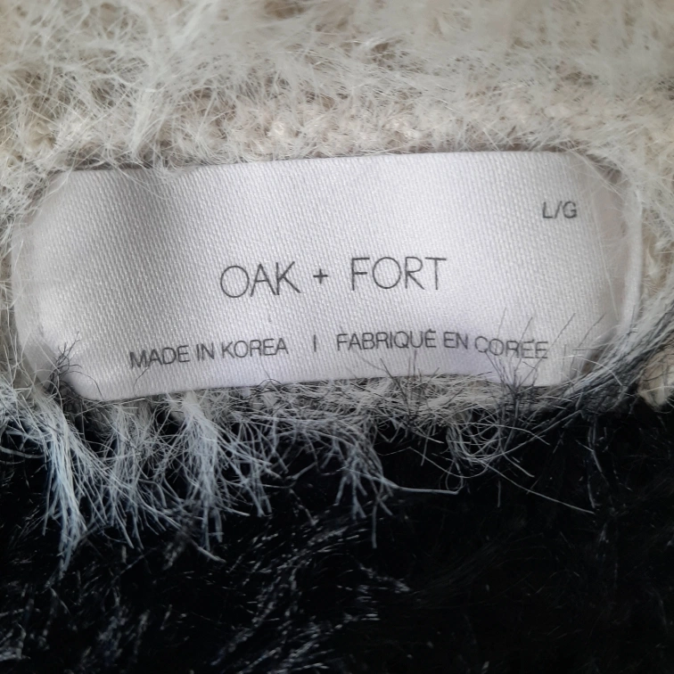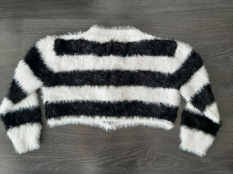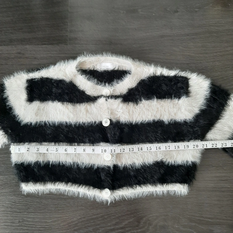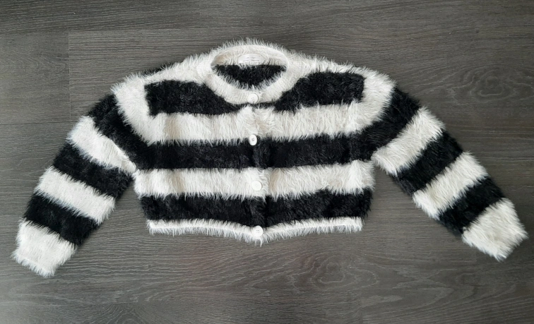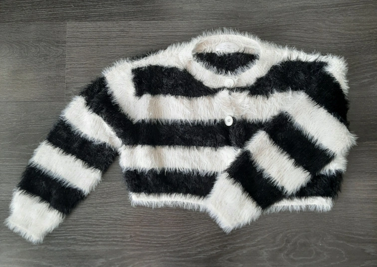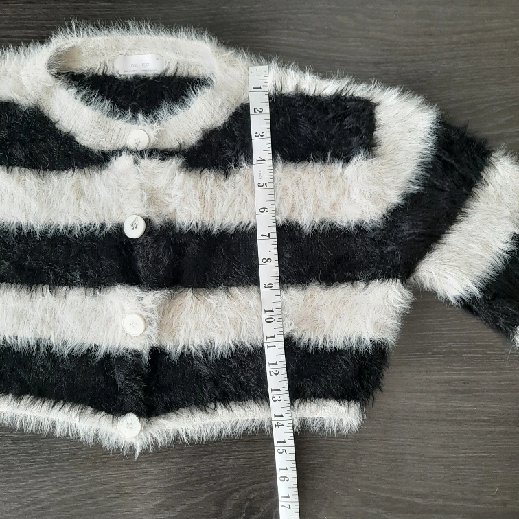 Here's OAK+FORT a girls' cardigan in a fun black and white striped pattern! It's a size L and features a button-up front. The material is soft and fuzzy, perfect for layering on cooler days. It measures approximately 22 inches across.