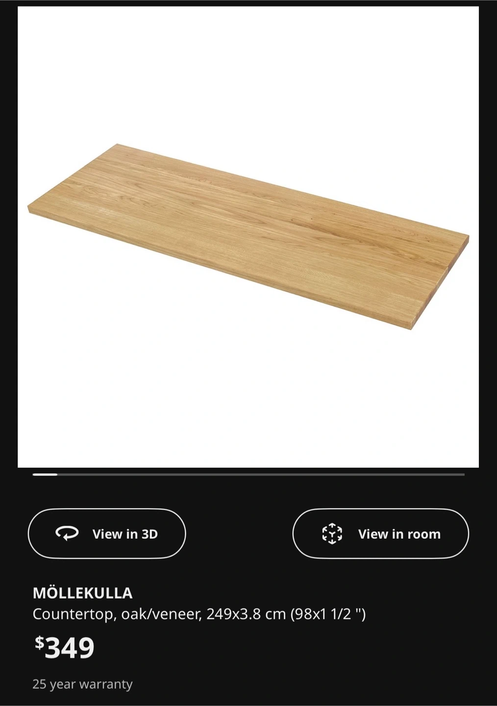 Selling an IKEA Möllekulla countertop in oak veneer. It measures 98 inches by 25 5/8 inches. Comes with LED lights and remote. In really good condition. This countertop is perfect for an extra long desktop or kitchen island. Originally bought for $349! Cash on collection only. Bring a friend/extra hands to help carry—item is long and heavy.