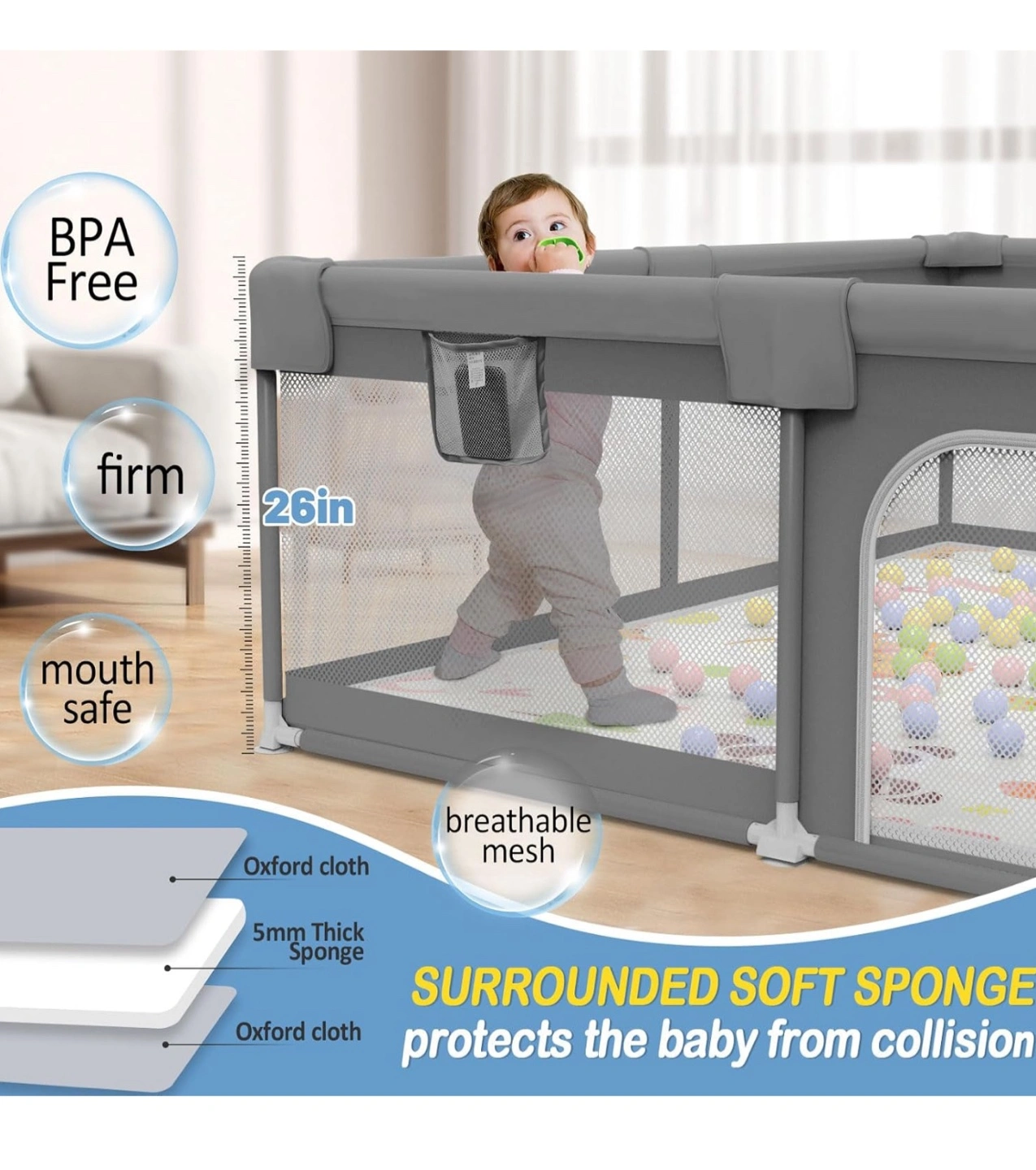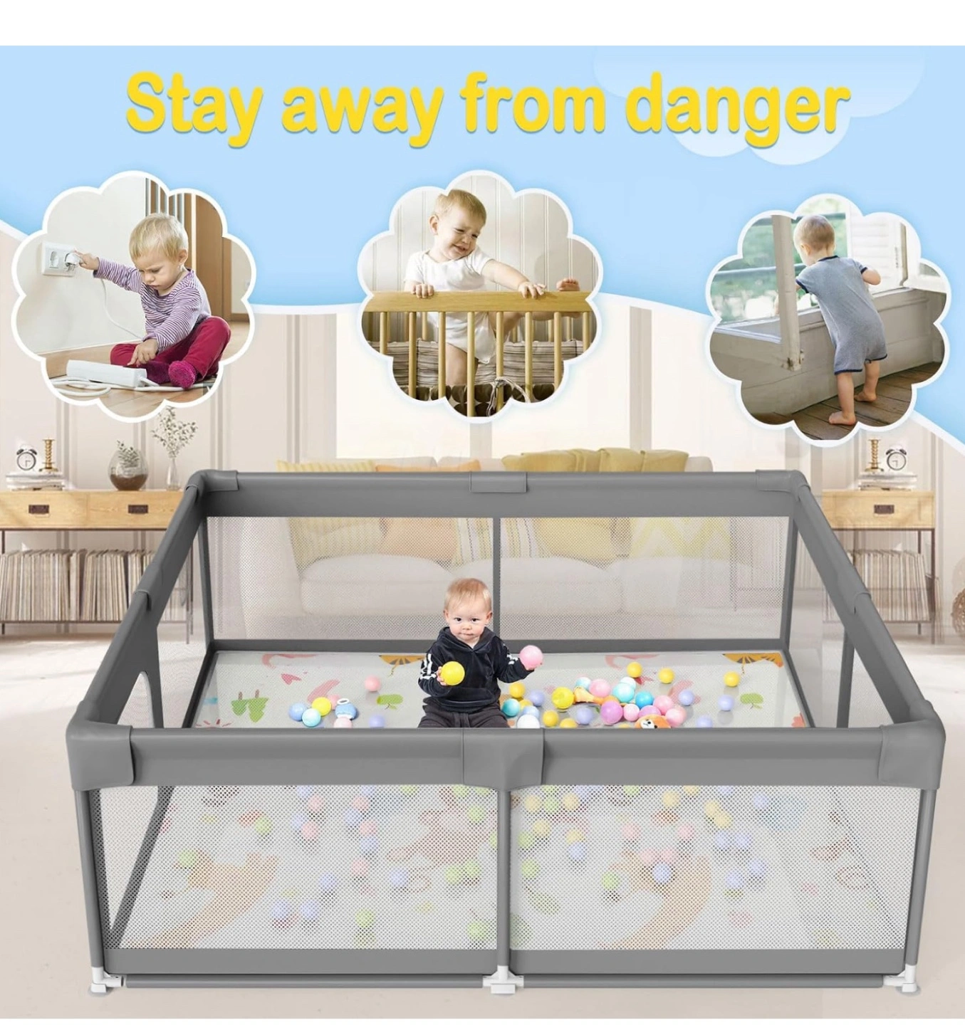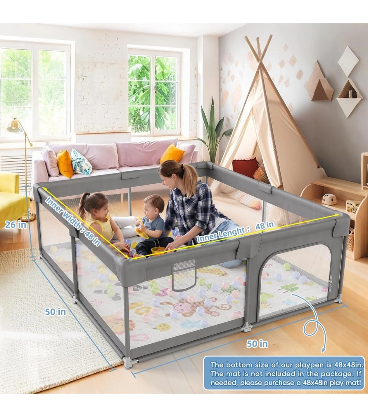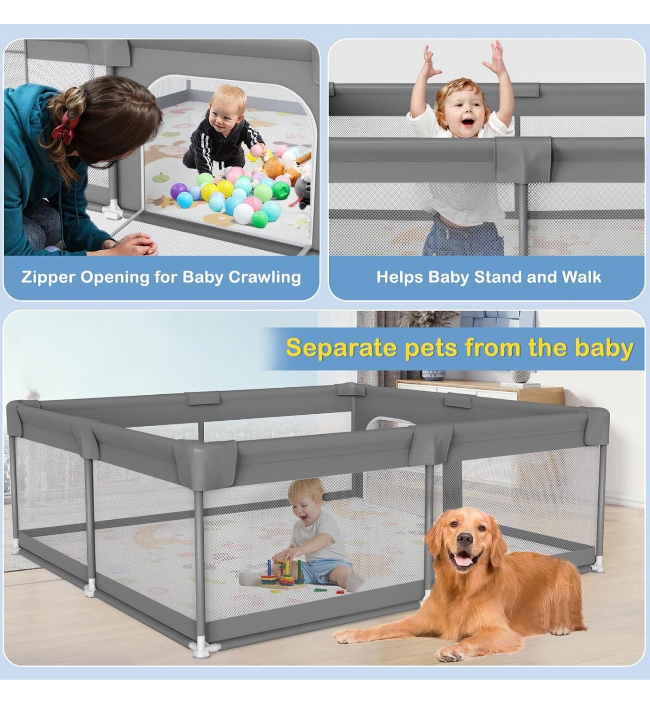 This grey baby playpen is perfect for keeping your little one safe while they explore! It features: - Zipper opening for baby crawling - Helps baby stand and walk - Separates pets from the baby - Dimensions: 50x50 inches - Height: 26 inches It's made with breathable mesh and surrounded by a soft sponge to protect your baby from collisions