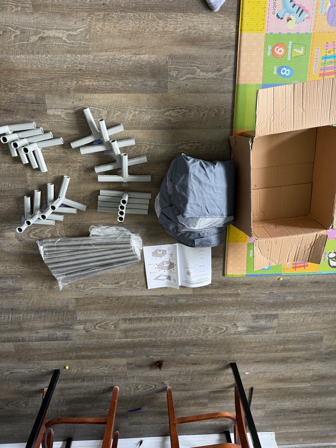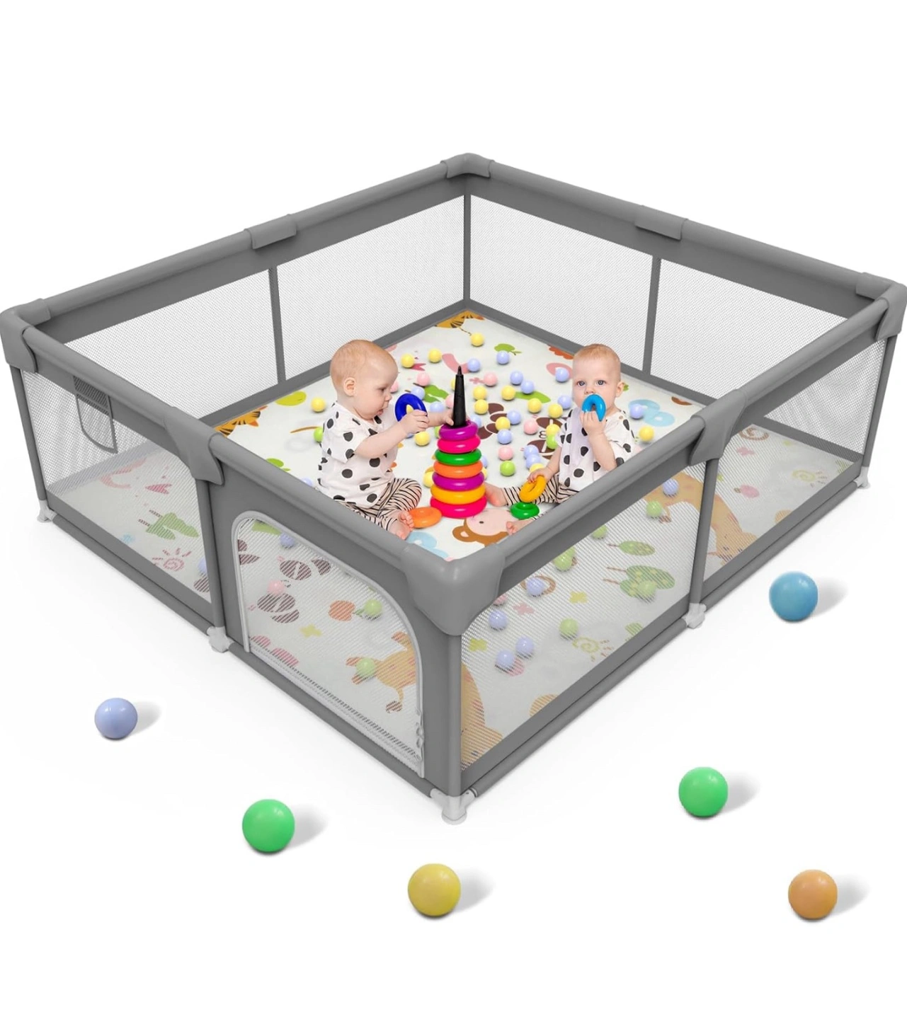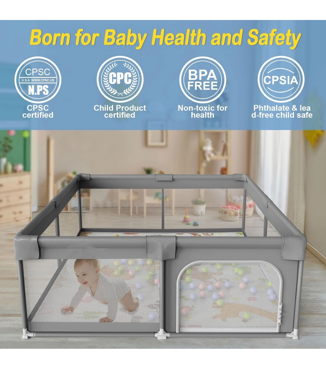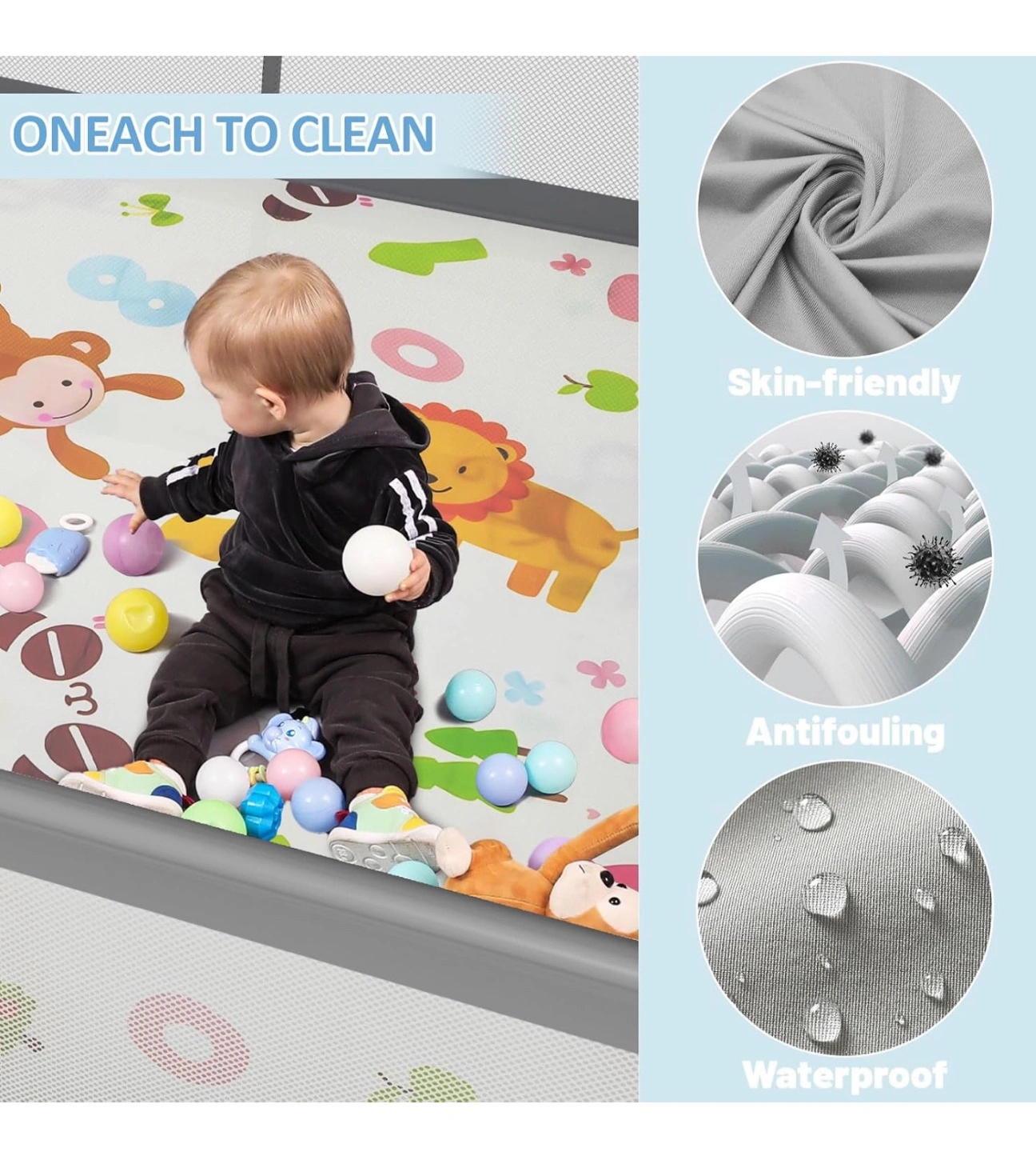 This grey baby playpen is perfect for keeping your little one safe while they explore! It features: - Zipper opening for baby crawling - Helps baby stand and walk - Separates pets from the baby - Dimensions: 50x50 inches - Height: 26 inches It's made with breathable mesh and surrounded by a soft sponge to protect your baby from collisions