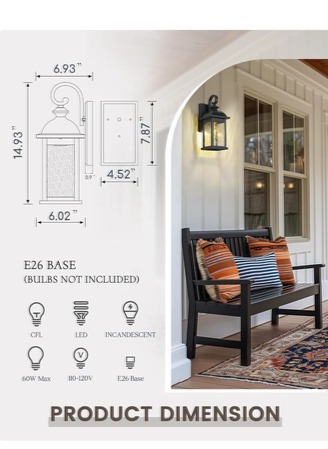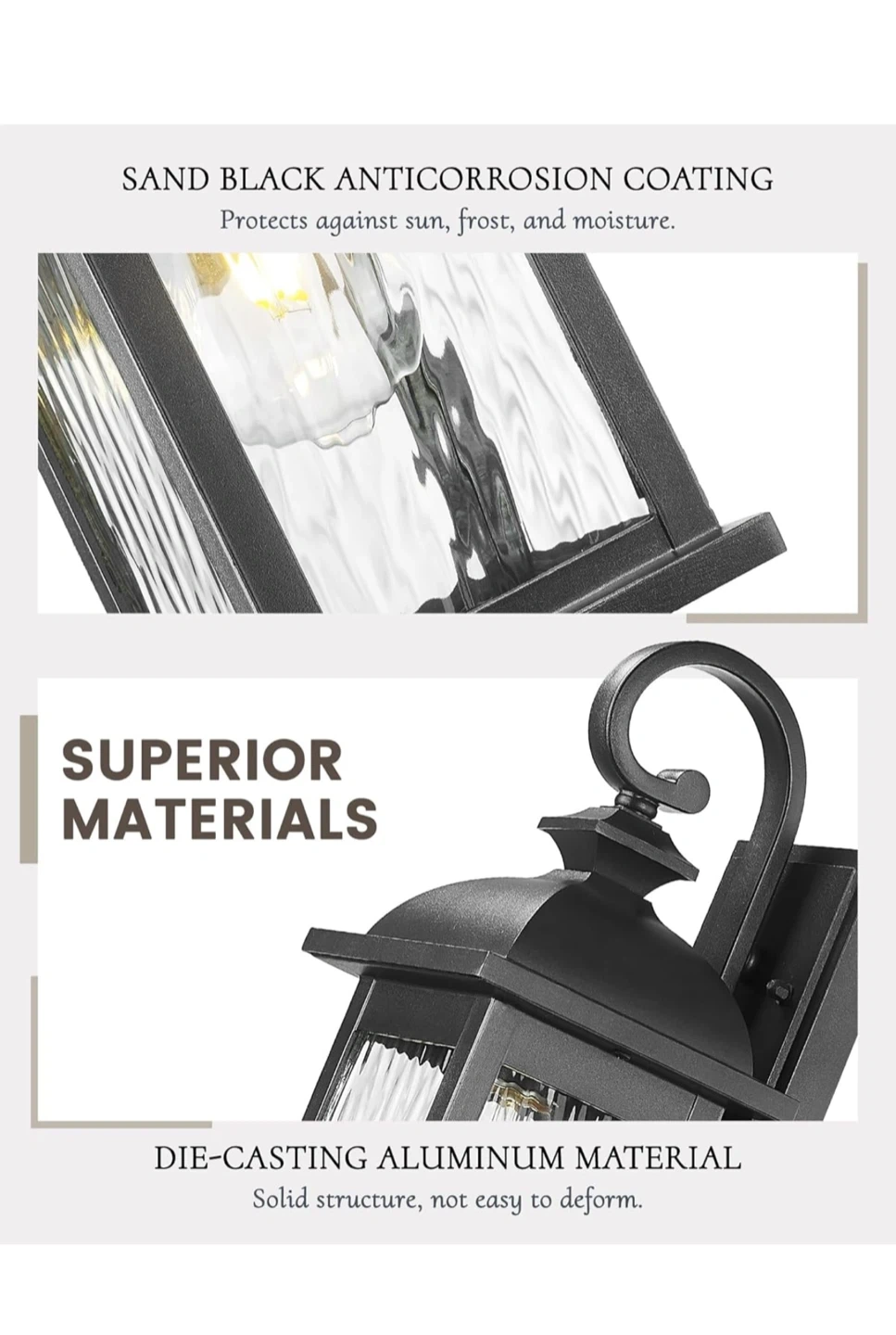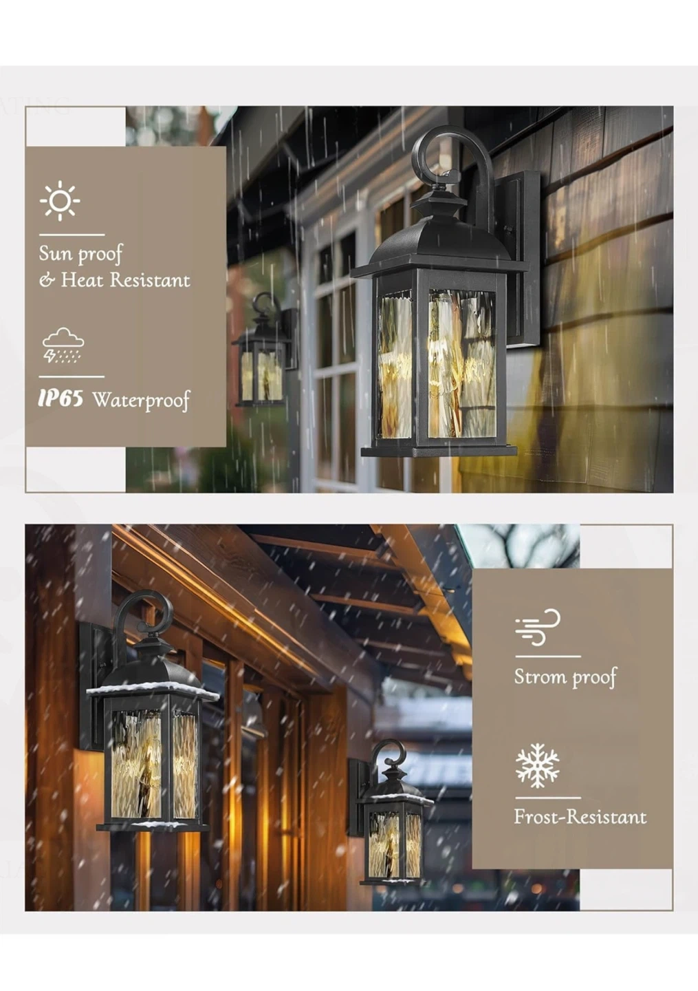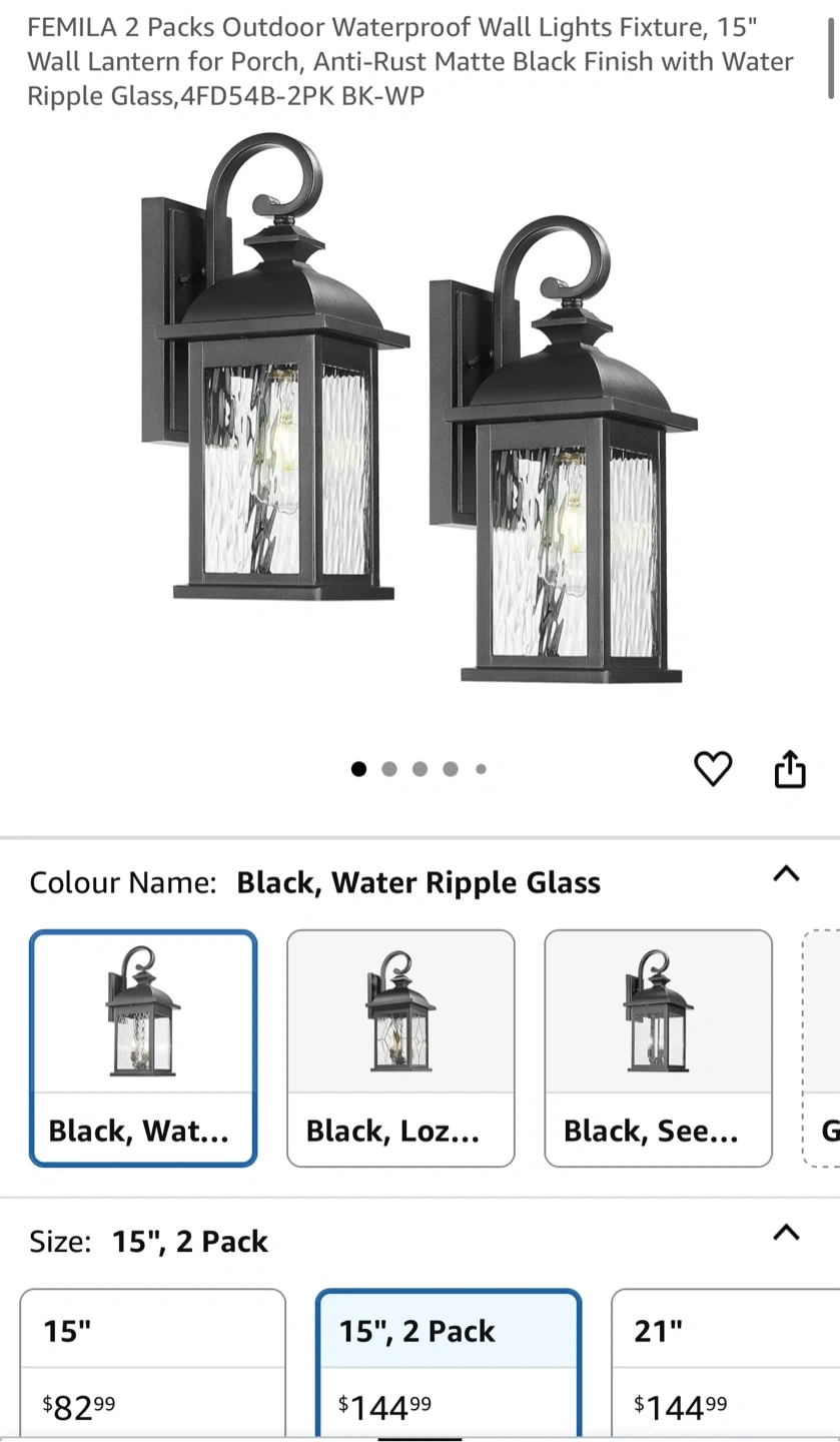 Selling a set of FEMILA outdoor wall lights. They're black with water ripple glass. Key features: - Waterproof (IP65) - Sun and heat resistant - Frost resistant - Storm proof Dimensions are approximately 14.93" height x 6.02" width x 6.93" depth. These use an E26 base, but bulbs are not included