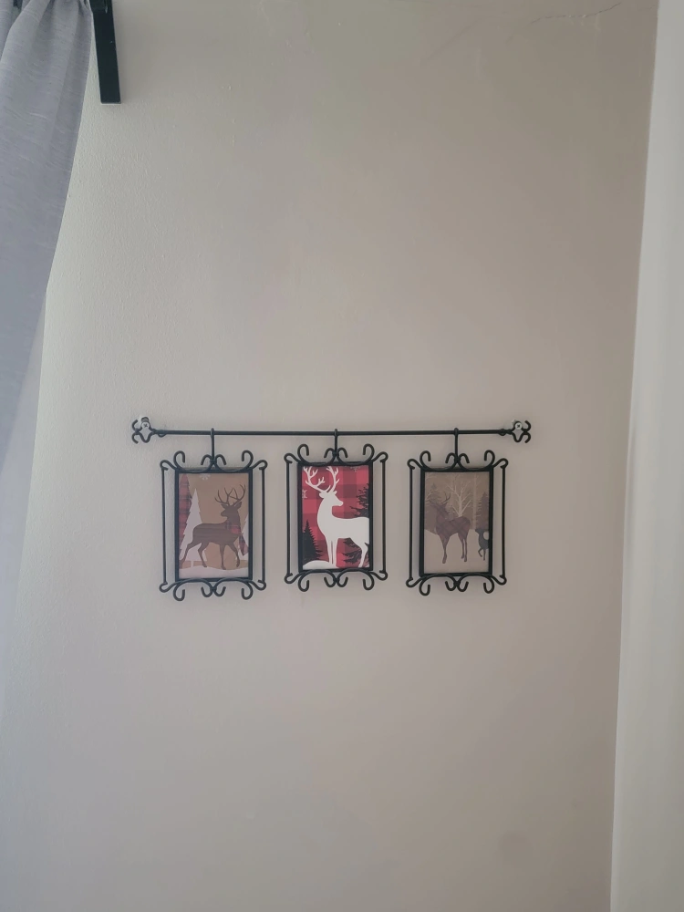 This is a lovely piece of wall decor featuring deer in frames. It has a decorative metal frame that adds a touch of elegance to any room. Perfect for adding a rustic or festive touch to your home!