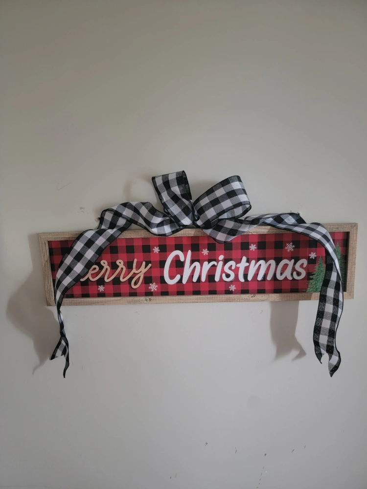 A festive Merry Christmas wall decor piece with a buffalo plaid design and a bow! Perfect for adding a touch of holiday cheer to your home