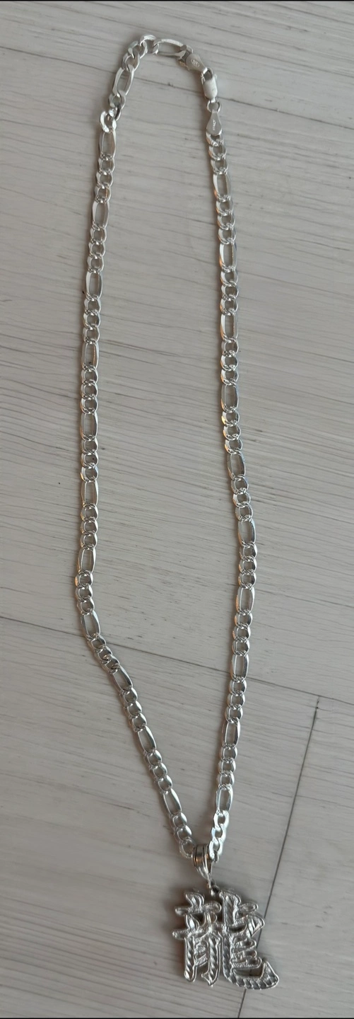 Weight is 28.5g Both are stamped 925 Pendant is dragon symbol Chain is 22 inches Cash only $80 obo for both
