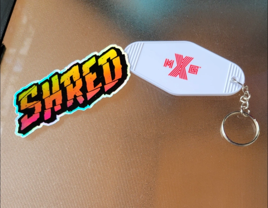 Selling a 'Shred' sticker and a white MXG keychain. Both are in great condition and ready for a new home! Perfect for adding some flair to your belongings
