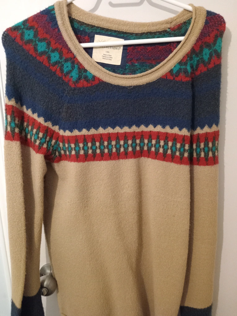 Cozy sweater from Selections in size L/G (Large/Grande)! The sweater features beige, blue, and red colours in a unique pattern. It's made of a soft material, perfect for staying warm on chilly days