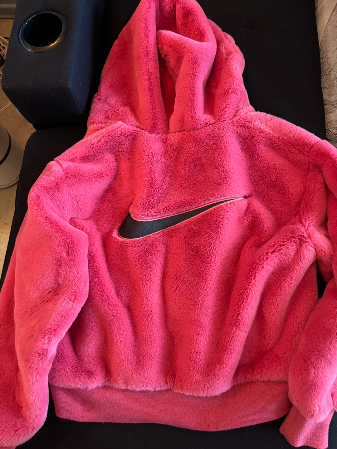 Super cozy Nike faux fur hoodie jacket, in a vibrant pink! This hoodie is perfect for adding a pop of colour and warmth to your wardrobe. It's in great condition and ready for a new home!