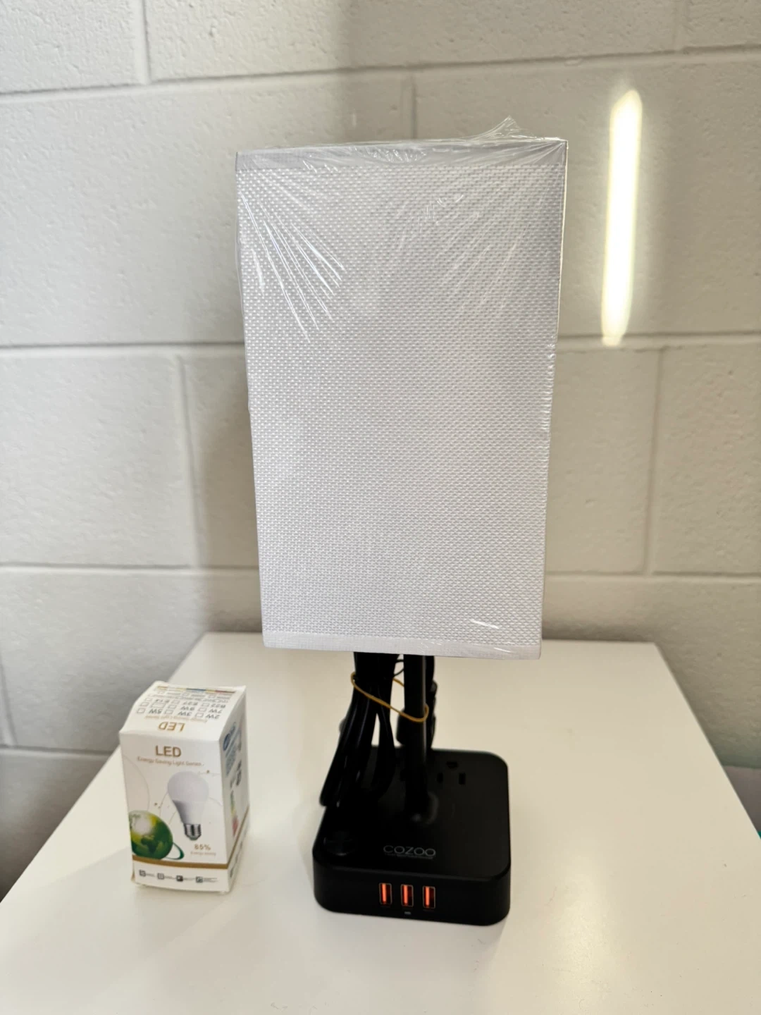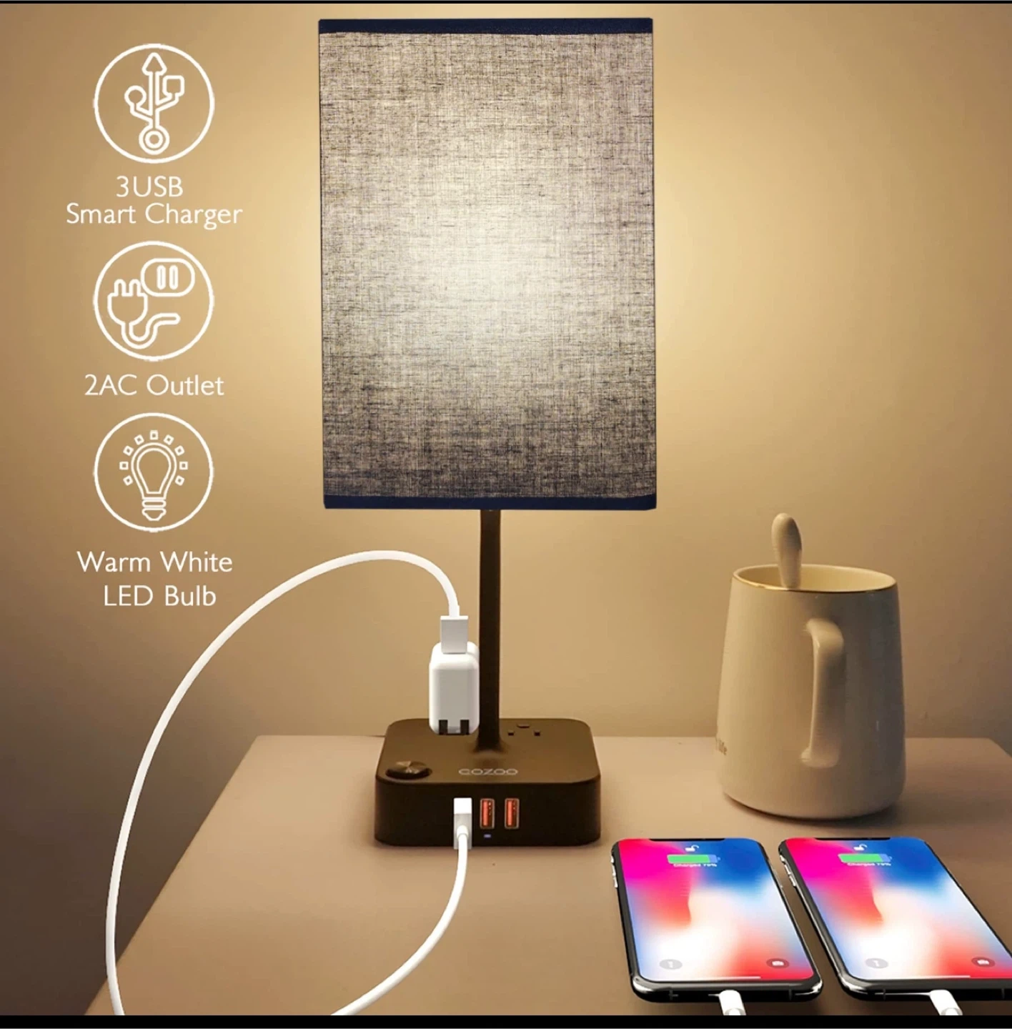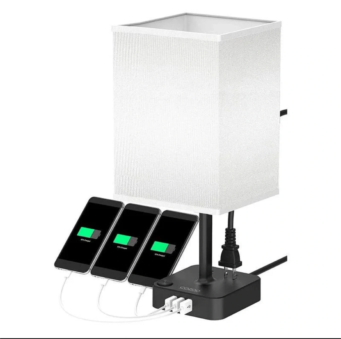 Color: WHITE COZOO Bedside Table Desk Lamp with 3 USB Charging Ports and 2 Outlets Power Strip,Charger Base with White Fabric Shade,LED Light Home Decor for Bedroom/Nightstand/End Table/Living Room/Dorm/Room Decor Selling a handy COZOO bedside lamp! It comes with 3 USB chargers and 2 AC outlets, perfect for charging your devices while you relax. The lamp includes a warm white LED bulb, so you're all set to go. It's in a brand new condition and ready to brighten up your space! Specifications: - AC Rated Input: 110-240V , 50/60Hz - AC Outelet Rated Output: AC 100-240V , 50/60Hz, 1250W - USB Total Output: DC 5V 4.0A (max) - Light Power: Max 60W - Light Source: E26/E27 base (5w bulb included) - Power Up State: US Plug - AC Power Cord: 5Ft - Switch Type: ON/OFF Switch - Material: Fireproof Plastics and Linen - Item Size: 13.65 x 4.72 x 4.72 in - Shade Size: 4.72 x4.72 x 7.87 in