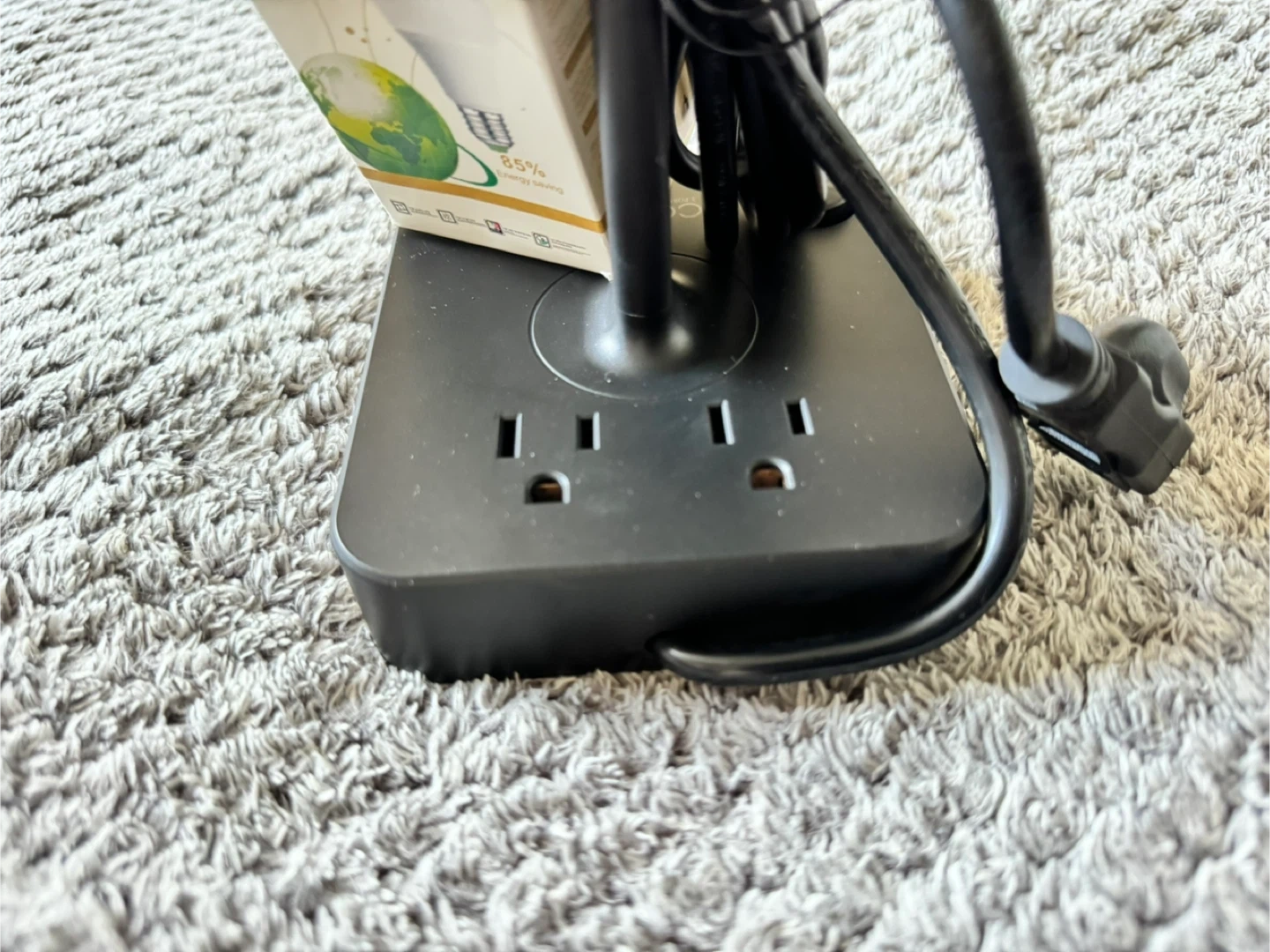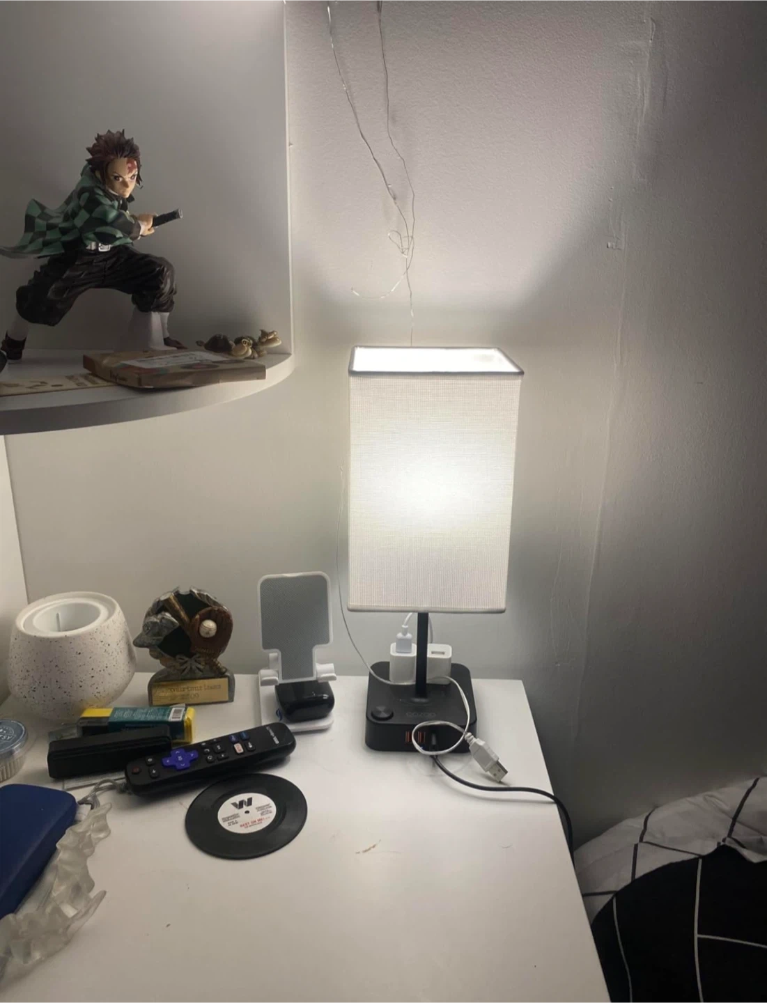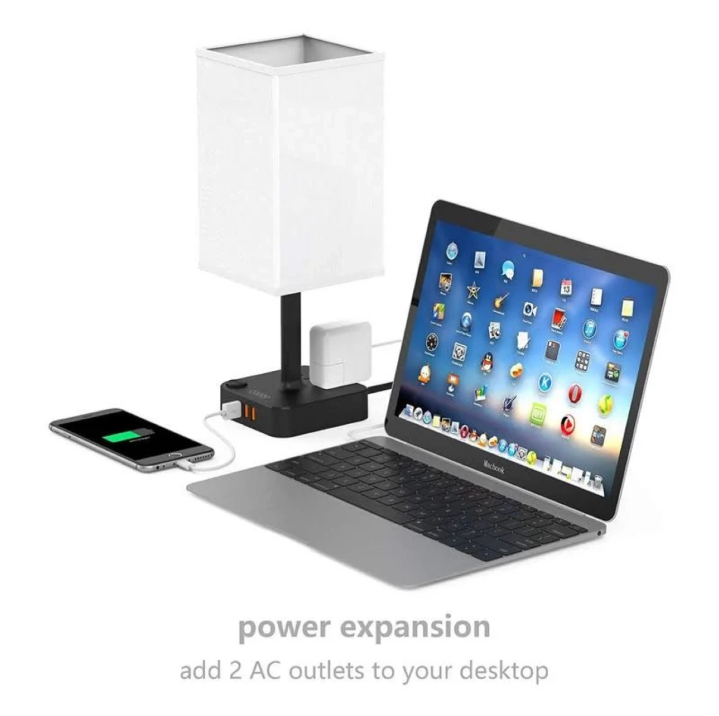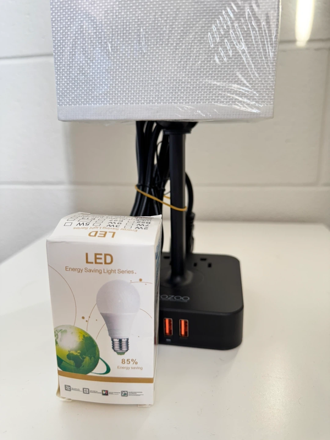 Color: WHITE COZOO Bedside Table Desk Lamp with 3 USB Charging Ports and 2 Outlets Power Strip,Charger Base with White Fabric Shade,LED Light Home Decor for Bedroom/Nightstand/End Table/Living Room/Dorm/Room Decor Selling a handy COZOO bedside lamp! It comes with 3 USB chargers and 2 AC outlets, perfect for charging your devices while you relax. The lamp includes a warm white LED bulb, so you're all set to go. It's in a brand new condition and ready to brighten up your space! Specifications: - AC Rated Input: 110-240V , 50/60Hz - AC Outelet Rated Output: AC 100-240V , 50/60Hz, 1250W - USB Total Output: DC 5V 4.0A (max) - Light Power: Max 60W - Light Source: E26/E27 base (5w bulb included) - Power Up State: US Plug - AC Power Cord: 5Ft - Switch Type: ON/OFF Switch - Material: Fireproof Plastics and Linen - Item Size: 13.65 x 4.72 x 4.72 in - Shade Size: 4.72 x4.72 x 7.87 in