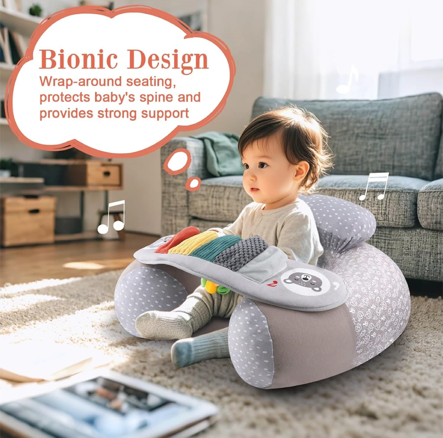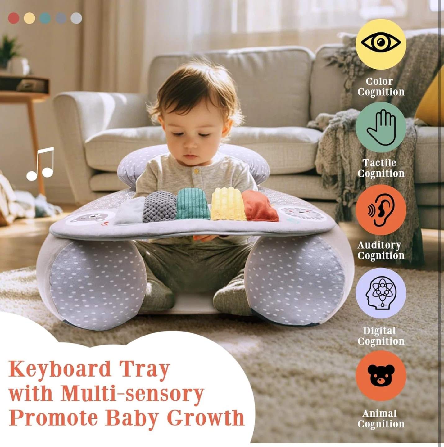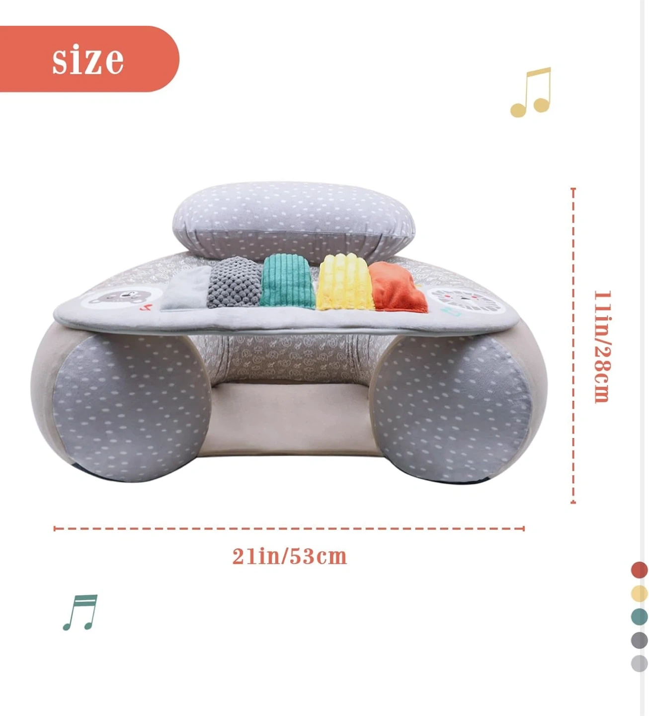 This baby inflatable seat provides great support for your little one while they play and rest! It features a bionic design that wraps around, protecting baby's spine and providing strong support. It also comes with a keyboard tray for multi-sensory stimulation to promote baby growth. Perfect for ages 3 months and up!