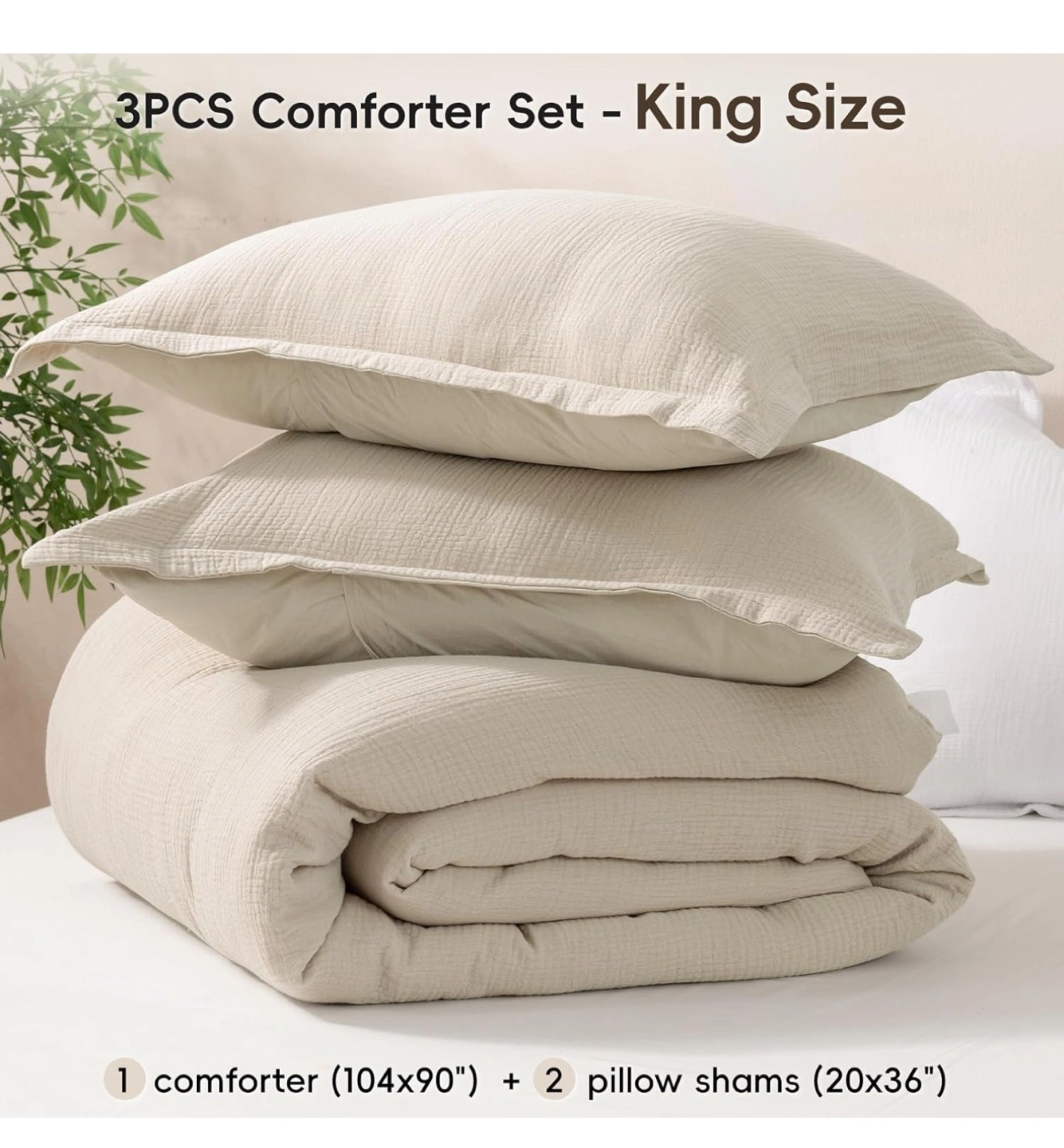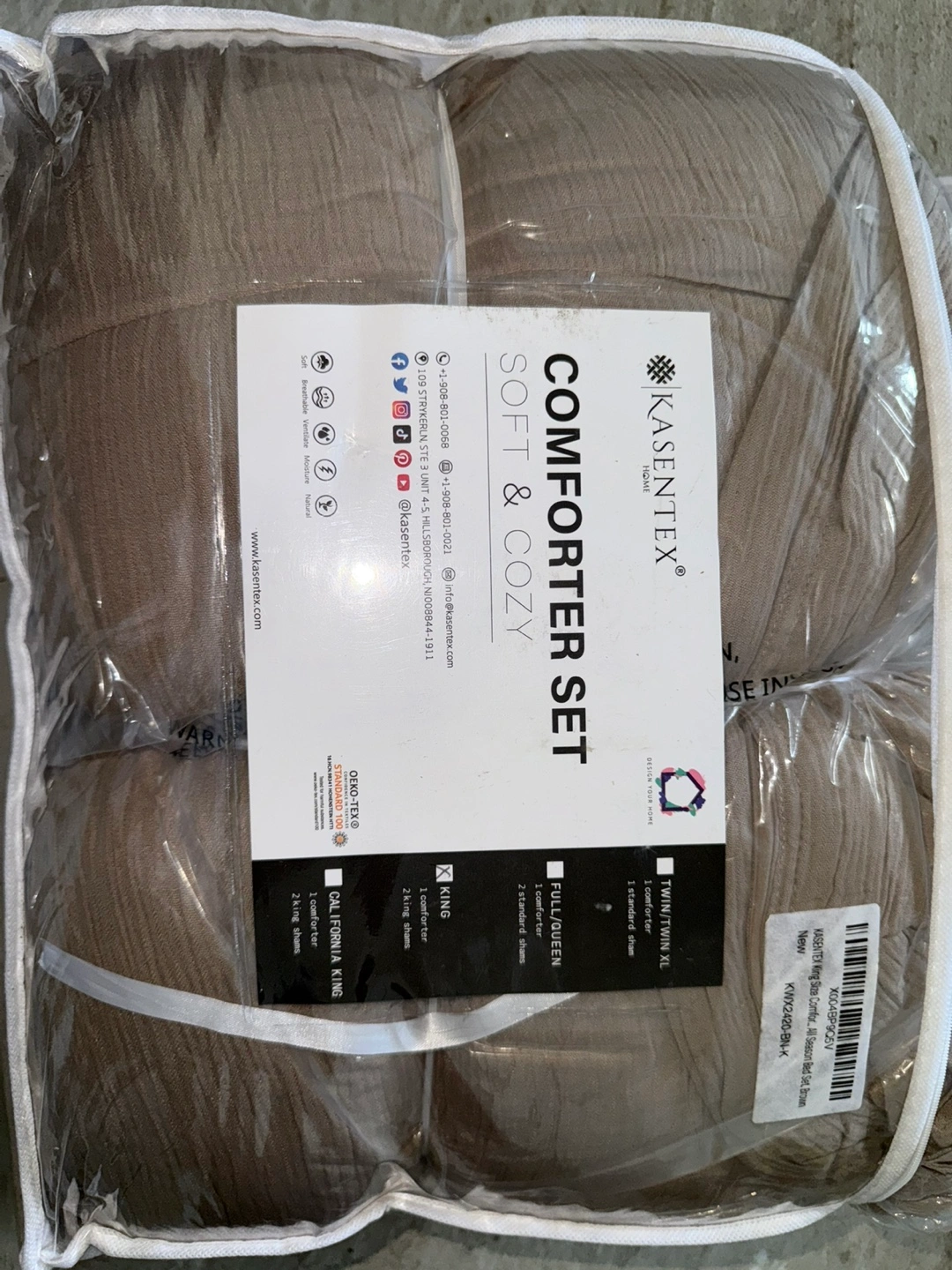 This is a brand new Kasentex comforter set in king size! The set includes one comforter (104x90") and two pillow shams (20x36"). It's made of a comfort cotton fabric, offering a gentle and soft touch with 100% cotton muslin fabric. It combines breathability and room decoration. Perfect for a soft and cozy feel!