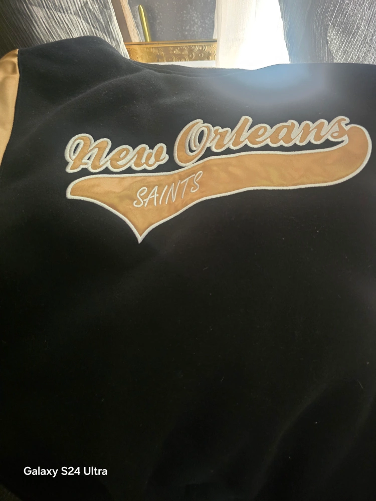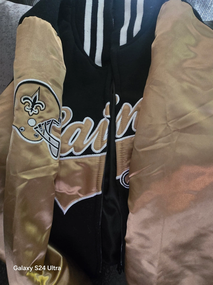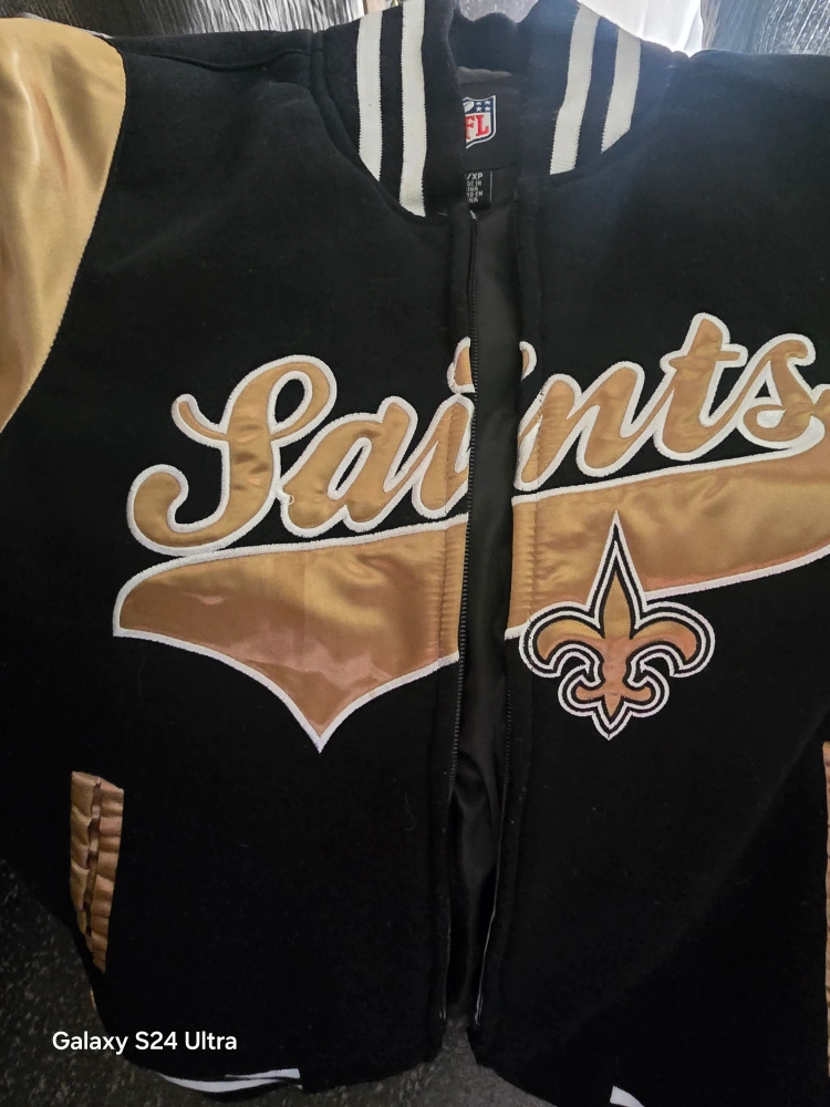 Selling a New Orleans Saints NFL jacket, size XS. It's black and gold, perfect for showing your team spirit!