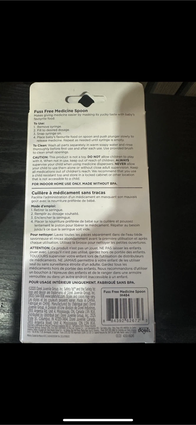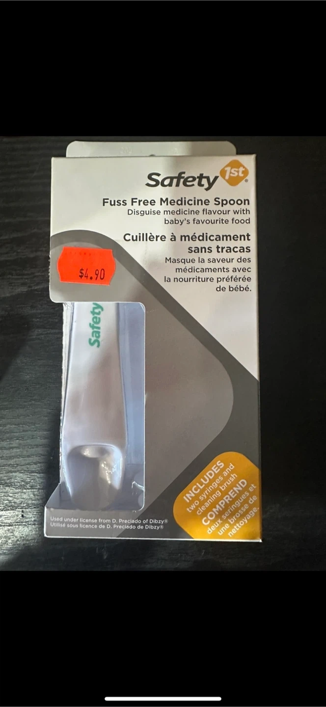I'm selling a brand new Safety 1st Fuss Free Medicine Spoon! It disguises medicine flavour with baby's favourite food. - Includes two syringes and cleaning brush - Made without BPA