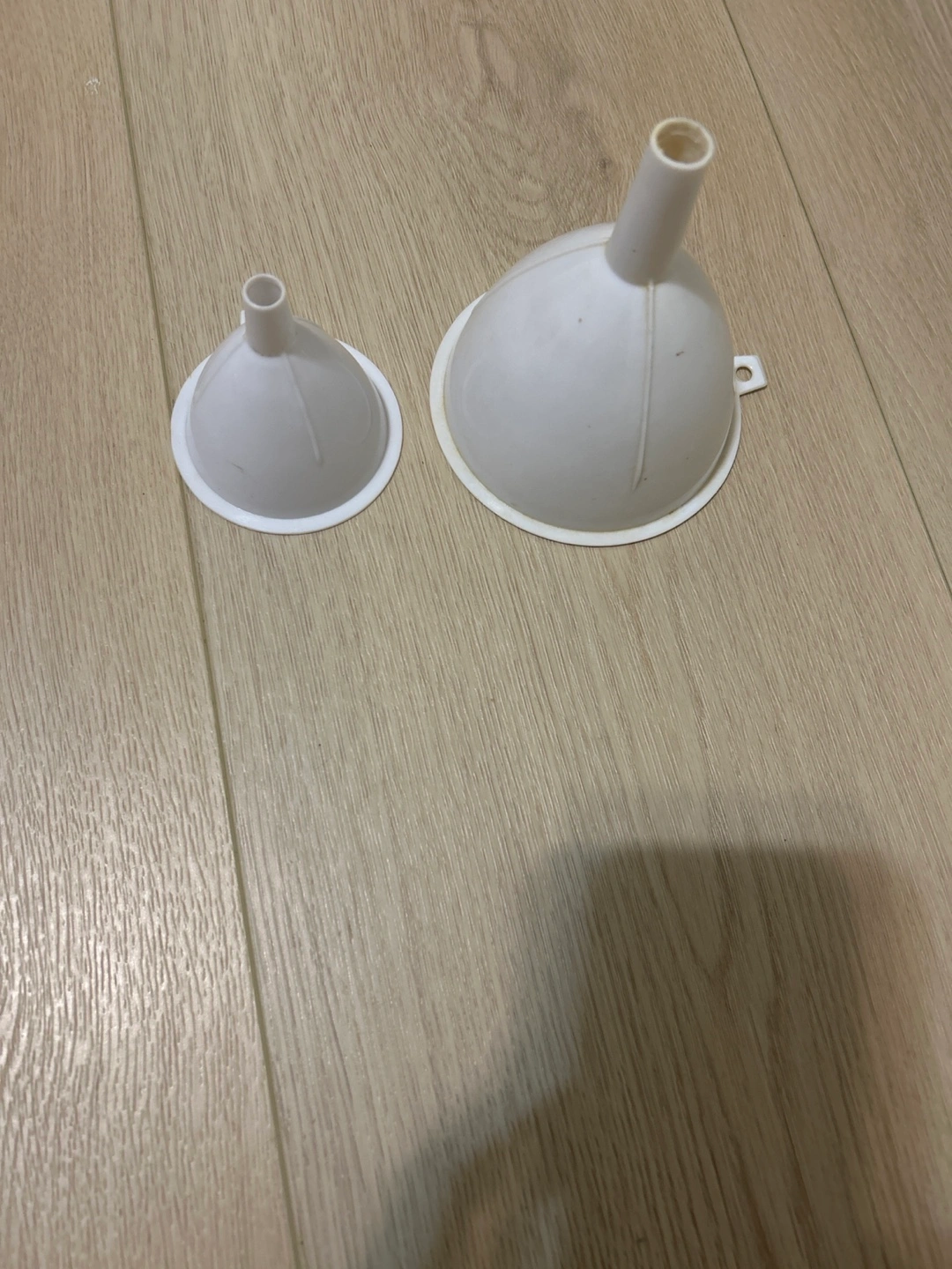 Selling a set of two white plastic funnels. They're in great shape and ready to help you with all your pouring needs!