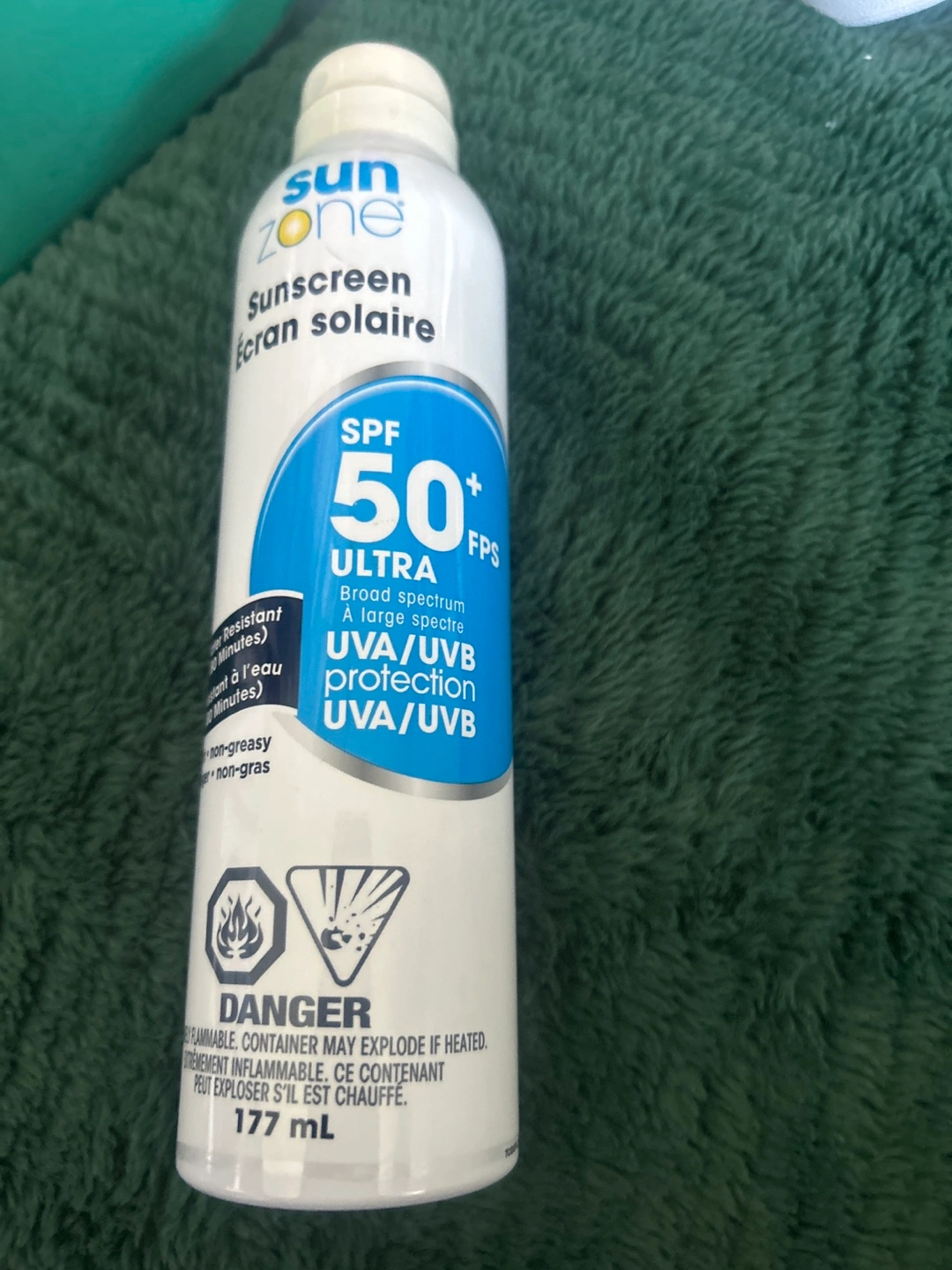 Selling a can of Sun Zone SPF 50 sunscreen. It's a broad spectrum sunscreen with UVA/UVB protection. The can is 177mL. It's also water resistant and non-greasy
