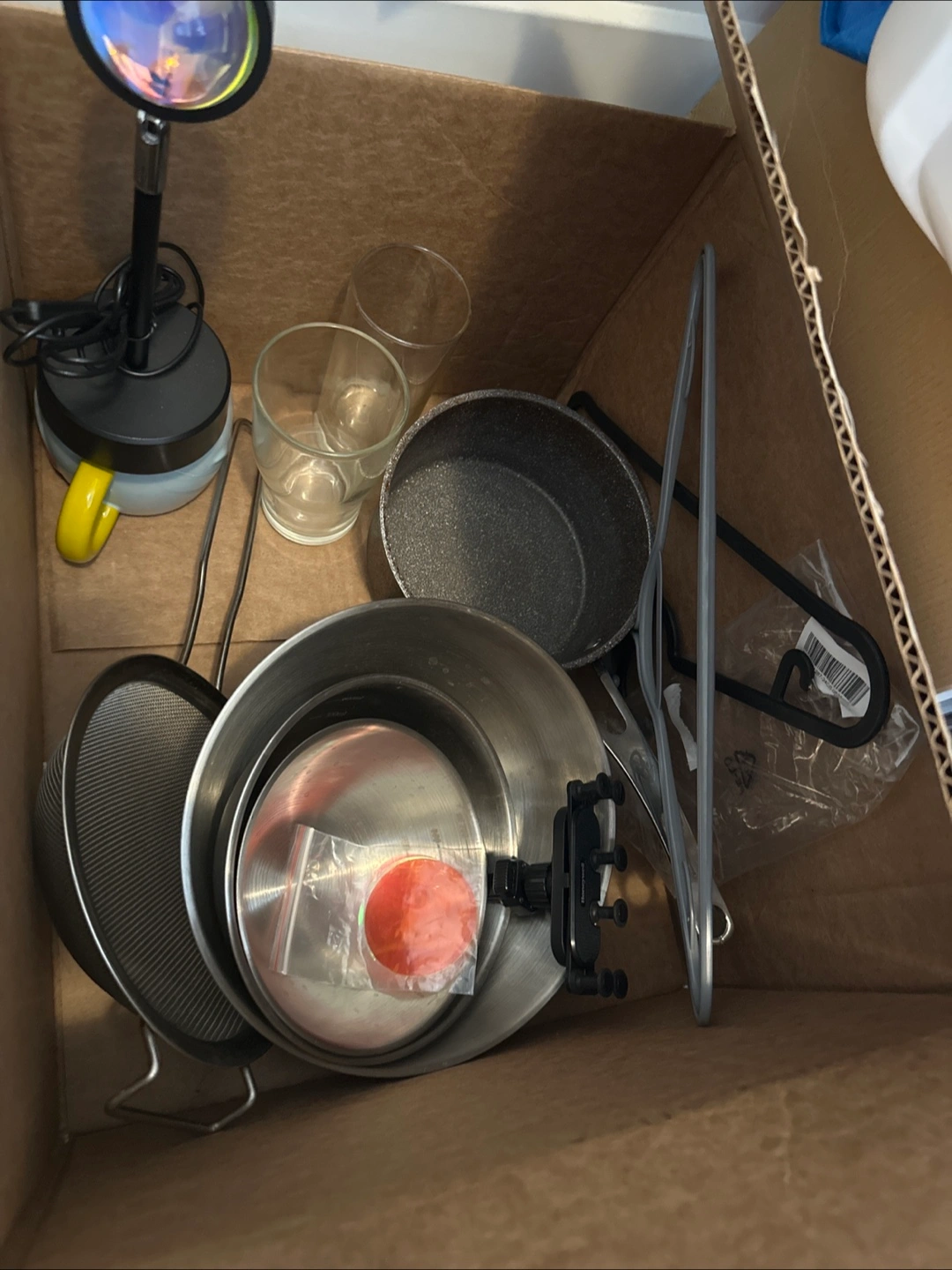 a variety of kitchen items including glasses, a pan, a strainer, and other accessories. All items are in good condition and ready for a new home. Perfect for stocking up a new kitchen or adding to your existing collection!