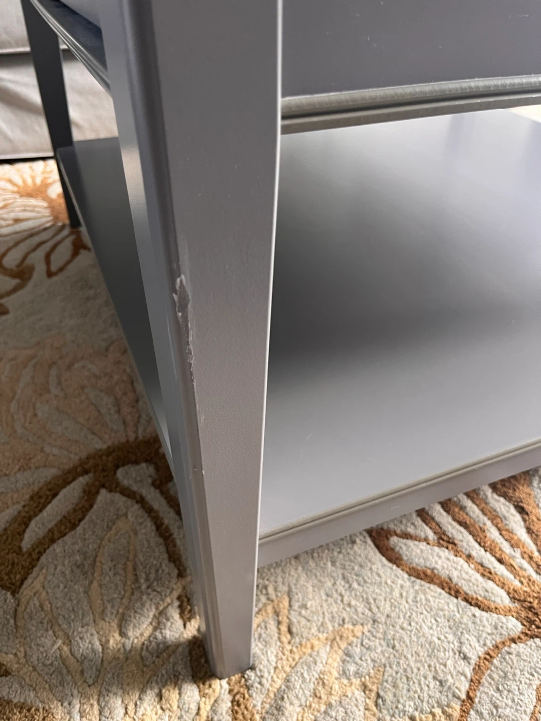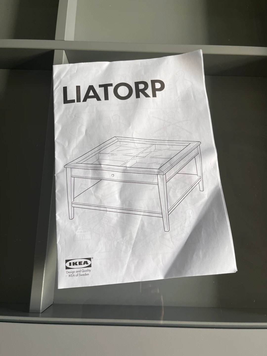 Selling an IKEA LIATORP coffee table with a glass top and a drawer for storage. It's a stylish piece that can add a touch of elegance to your living room. There's a small chip on one of the legs, but overall it's in good condition and still very functional. Comes with the original instructions