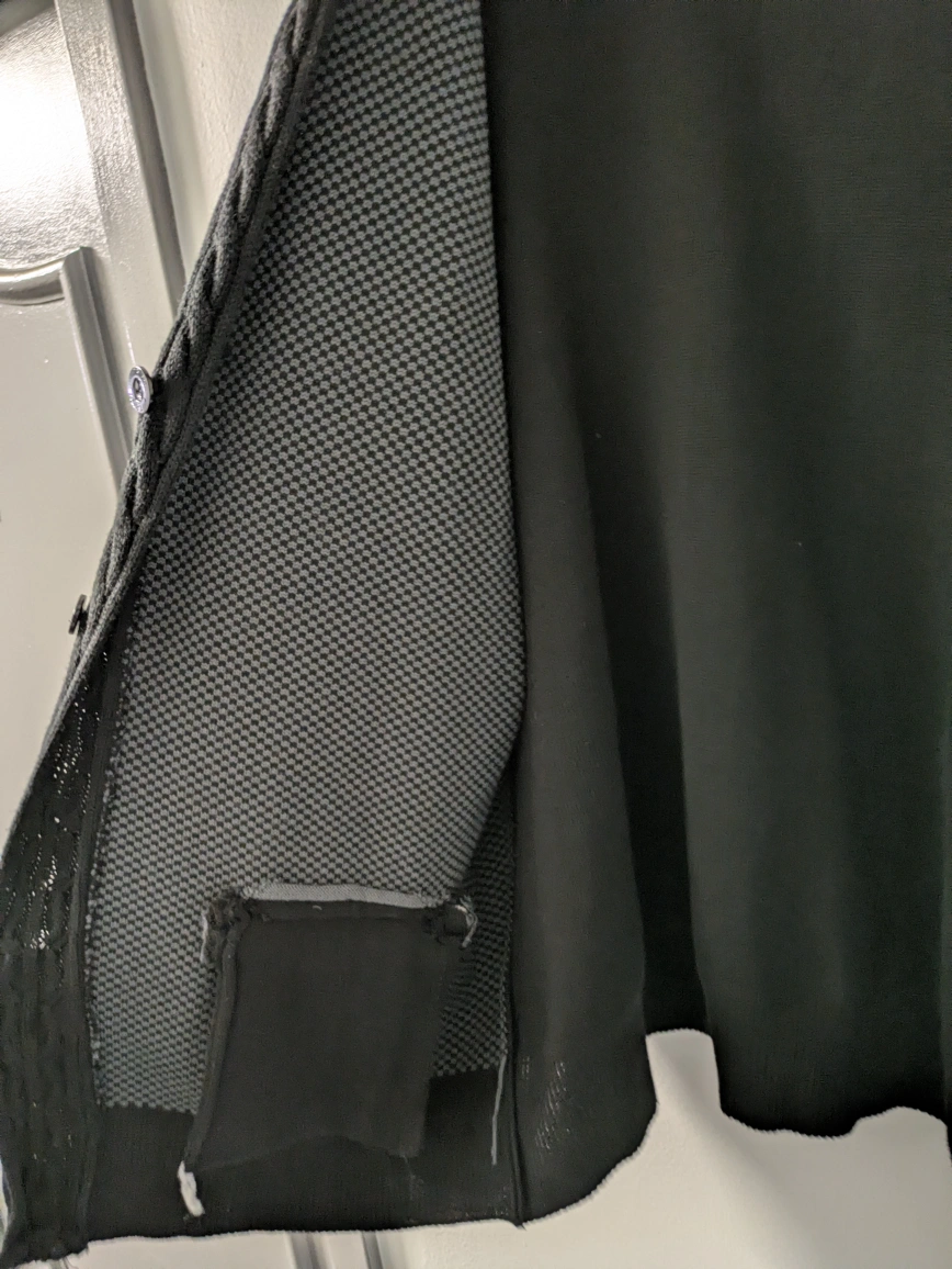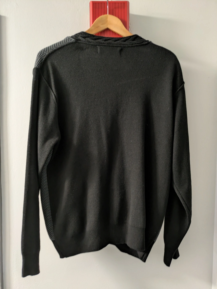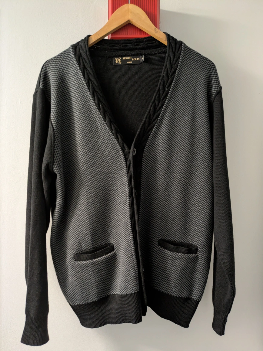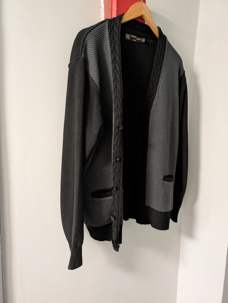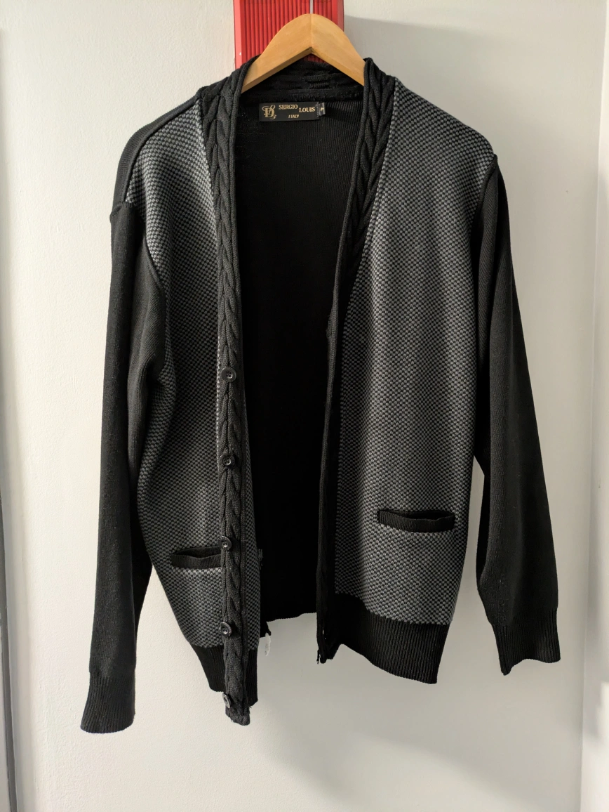 Selling a Sergio Louis cardigan in size 48. It's black with a patterned design on the front. Perfect for layering!