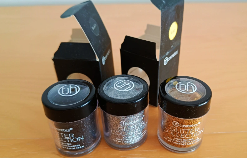 Selling a set of BH Cosmetics Glitter Collection in black, silver, and gold. Each container holds 0.28 oz / 8g of loose glitter. Two comes with the original boxes! All brand new and unused