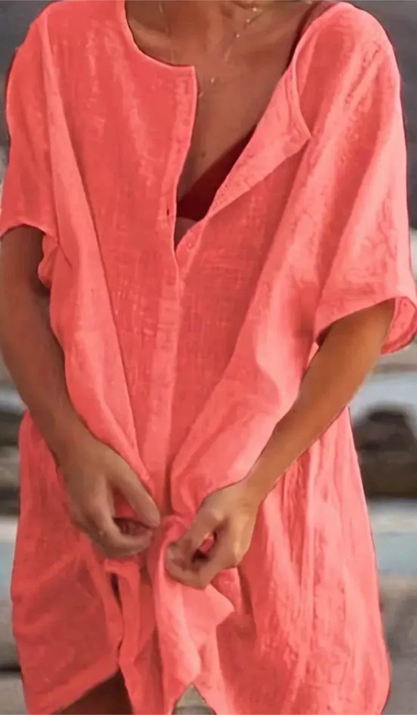 A lovely coral-coloured tunic dress, or swimsuit cover up or just pair it with your favourite leggings or capris. perfect for a casual day out! It's lightweight and comfortable, making it ideal for warmer weather. The material feels soft and breathable, and the style is quite versatile. Size is China sizing which in US sizing of size 18-22