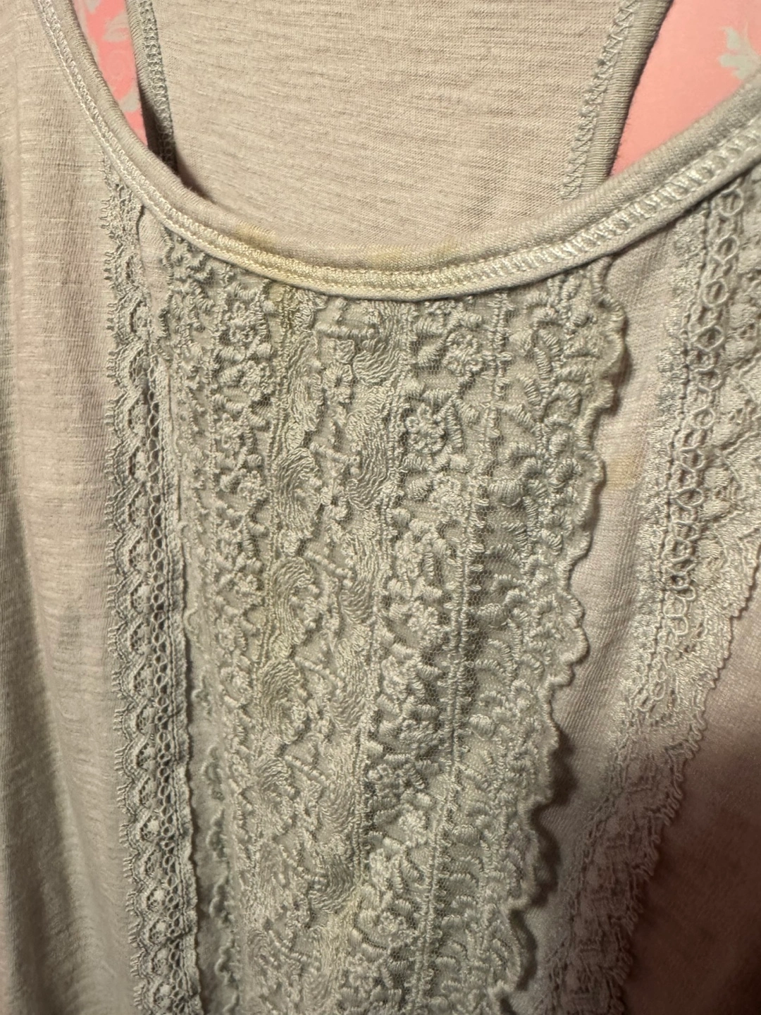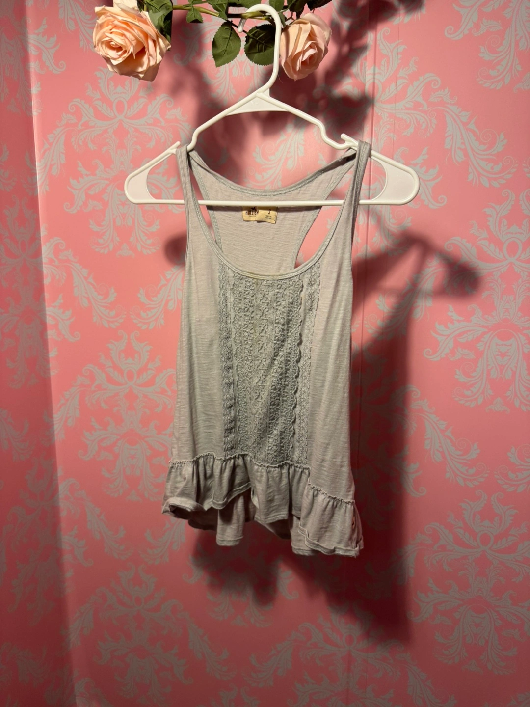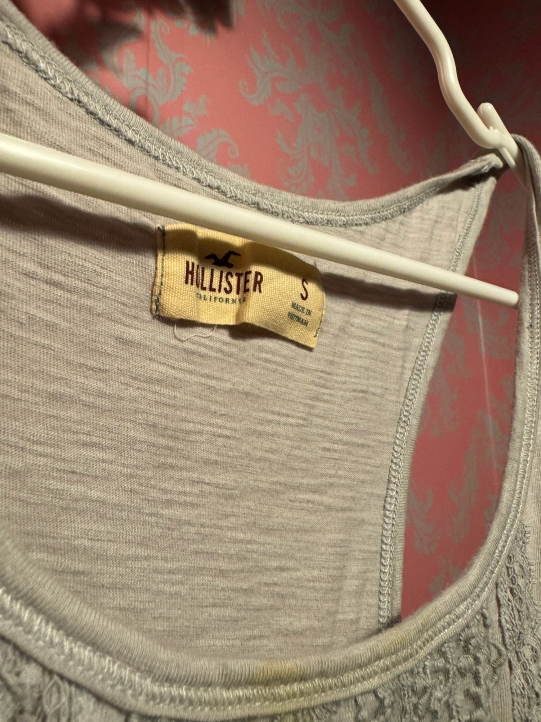A cute Hollister tank top, perfect for summer! It's a size small and has a lovely lace detail down the front. There are some signs of wear, but it's still got lots of life left!