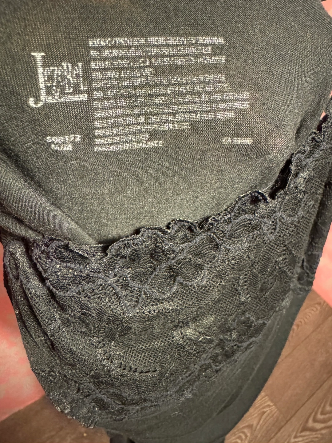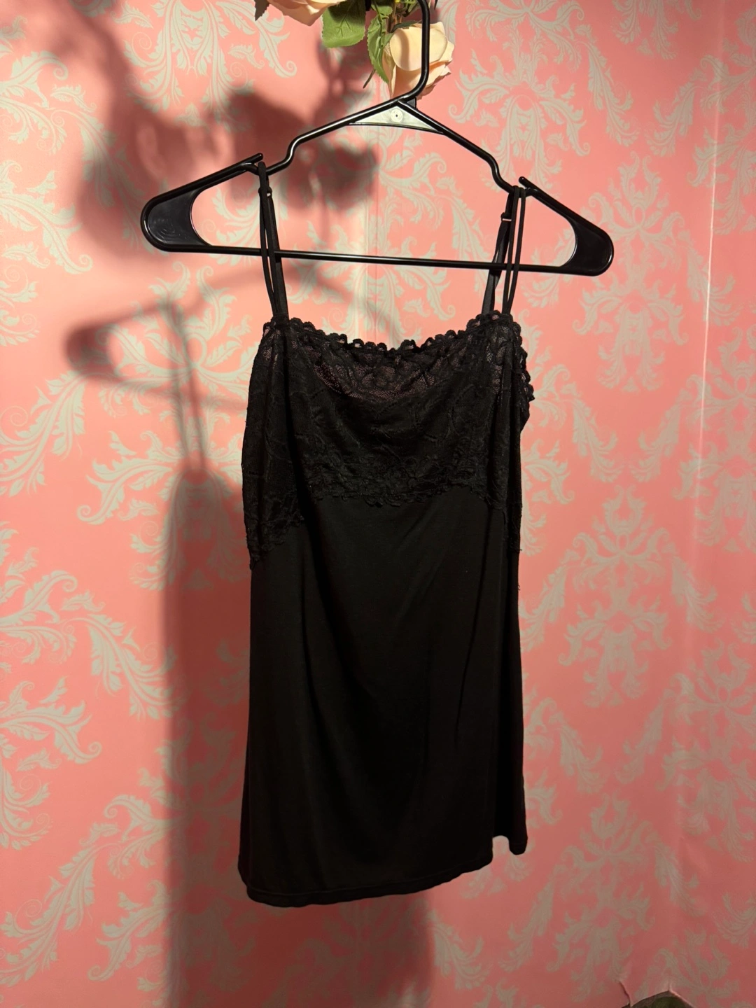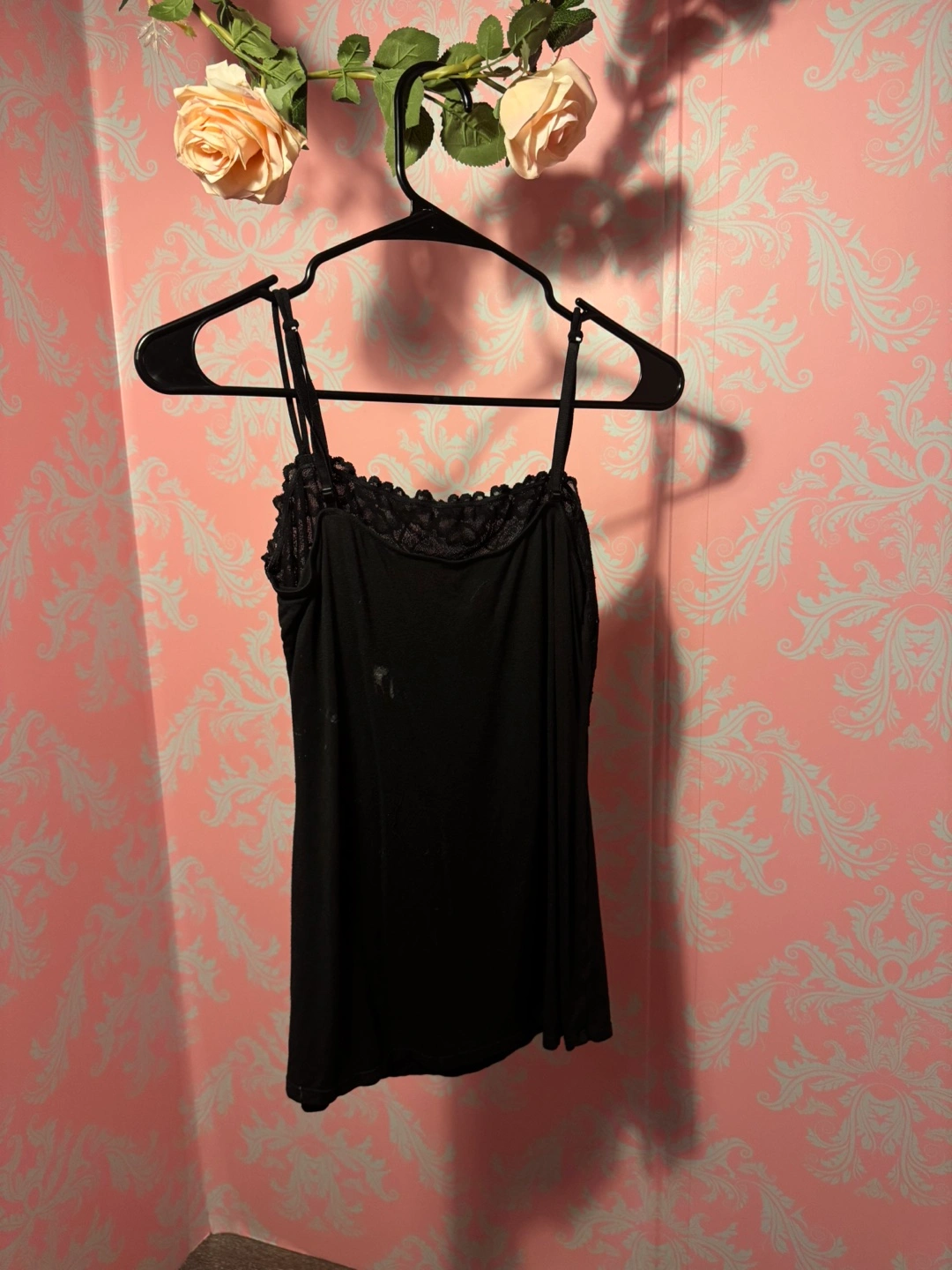 A cute black cami from Jezebel with a lace trim! It's a size medium. Perfect for layering or wearing on its own!