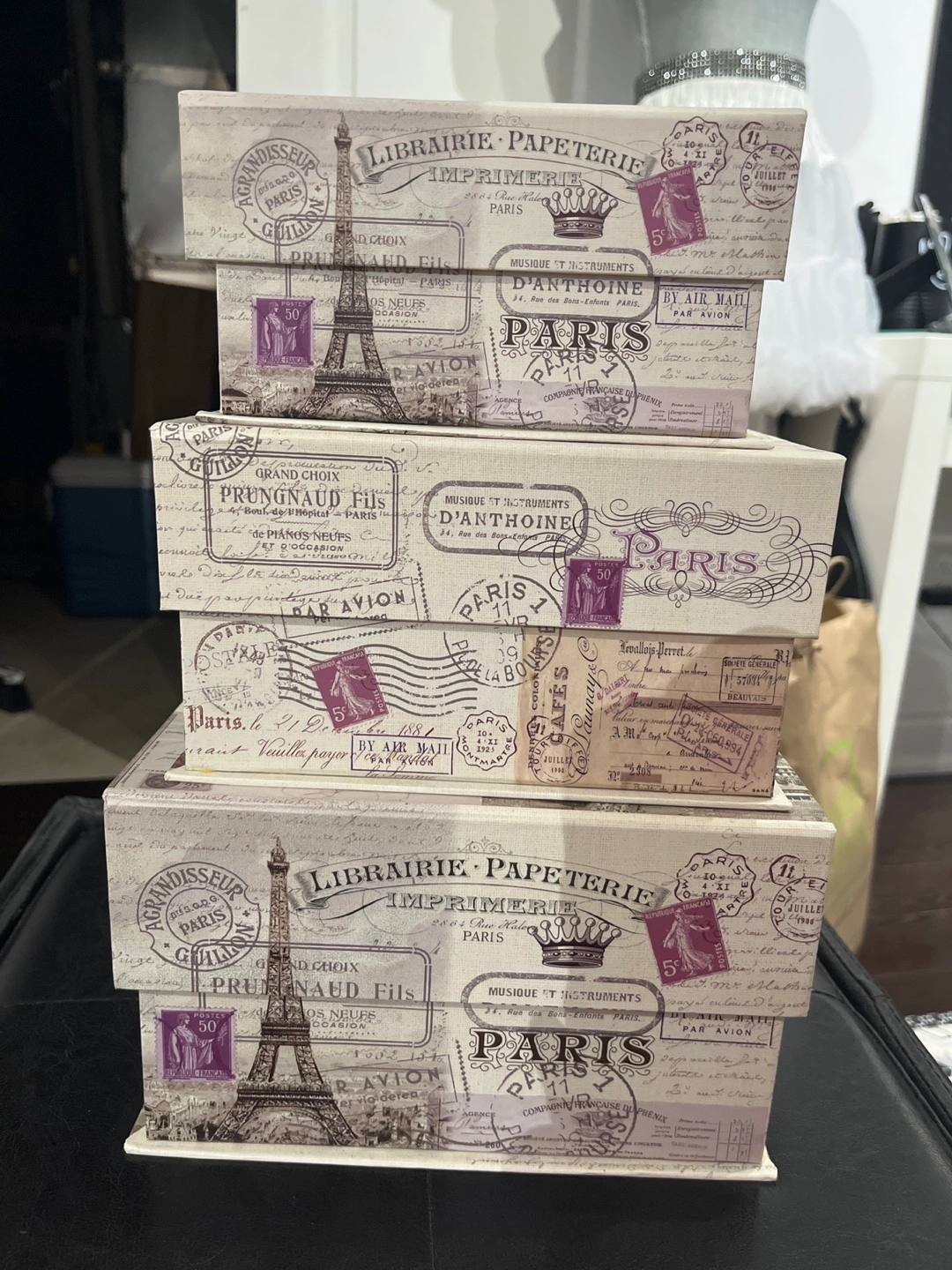 These decorative storage boxes feature a charming Paris theme, complete with images of the Eiffel Tower and vintage postage stamps. They're perfect for adding a touch of Parisian flair to your home decor while keeping your belongings organized. The boxes are adorned with text in French, including "Librairie Papeterie" and "Paris".