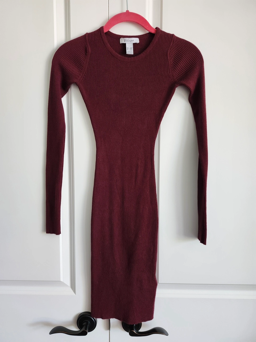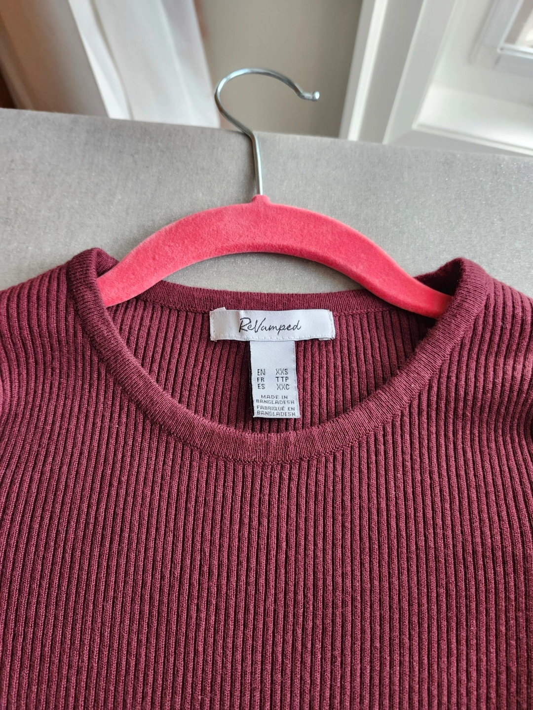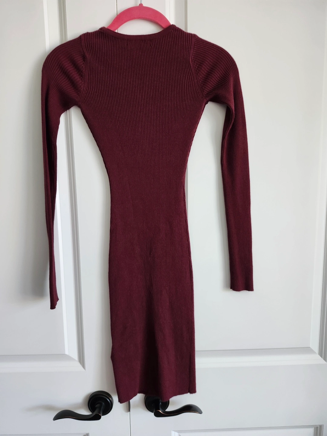 Young Teen Burgundy Knit Dress, I have taken the pics with the dress on a hanger but I have taken it off the hanger so the shoulders don’t stretch out, no major signs of wear, size XXS, 80% Viscose 20% Nylon, $15 or best offer.