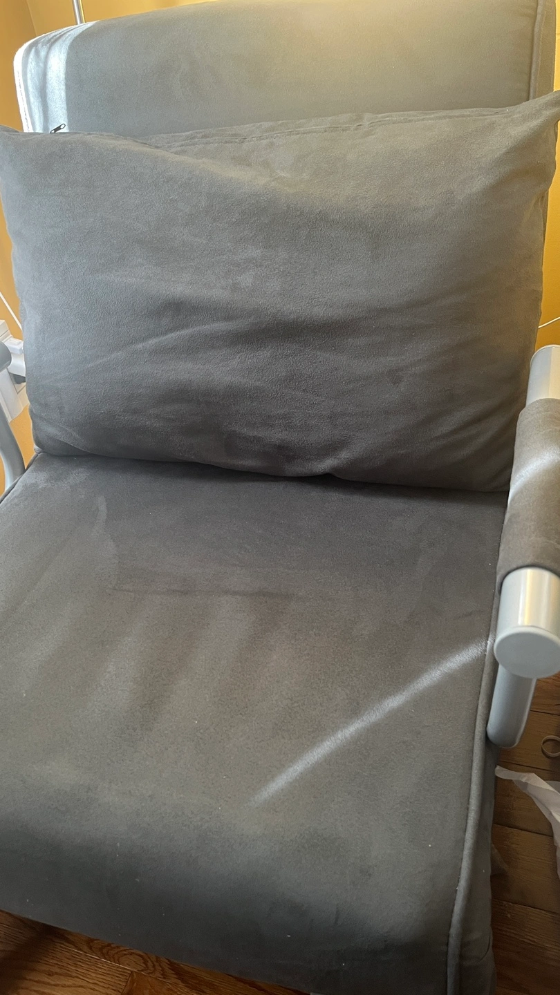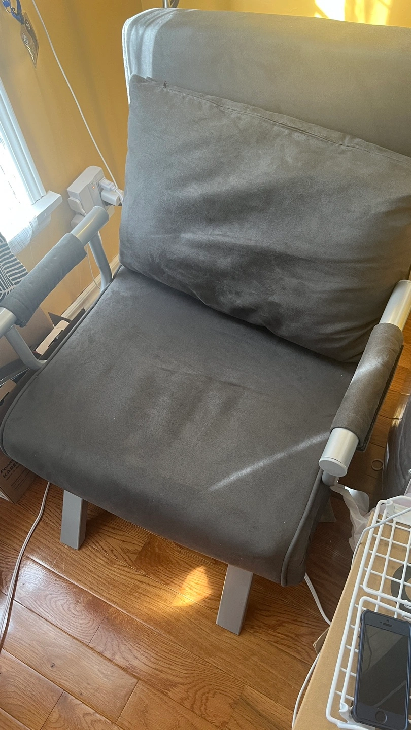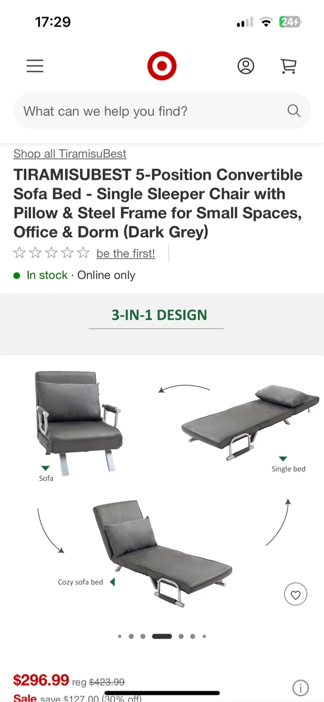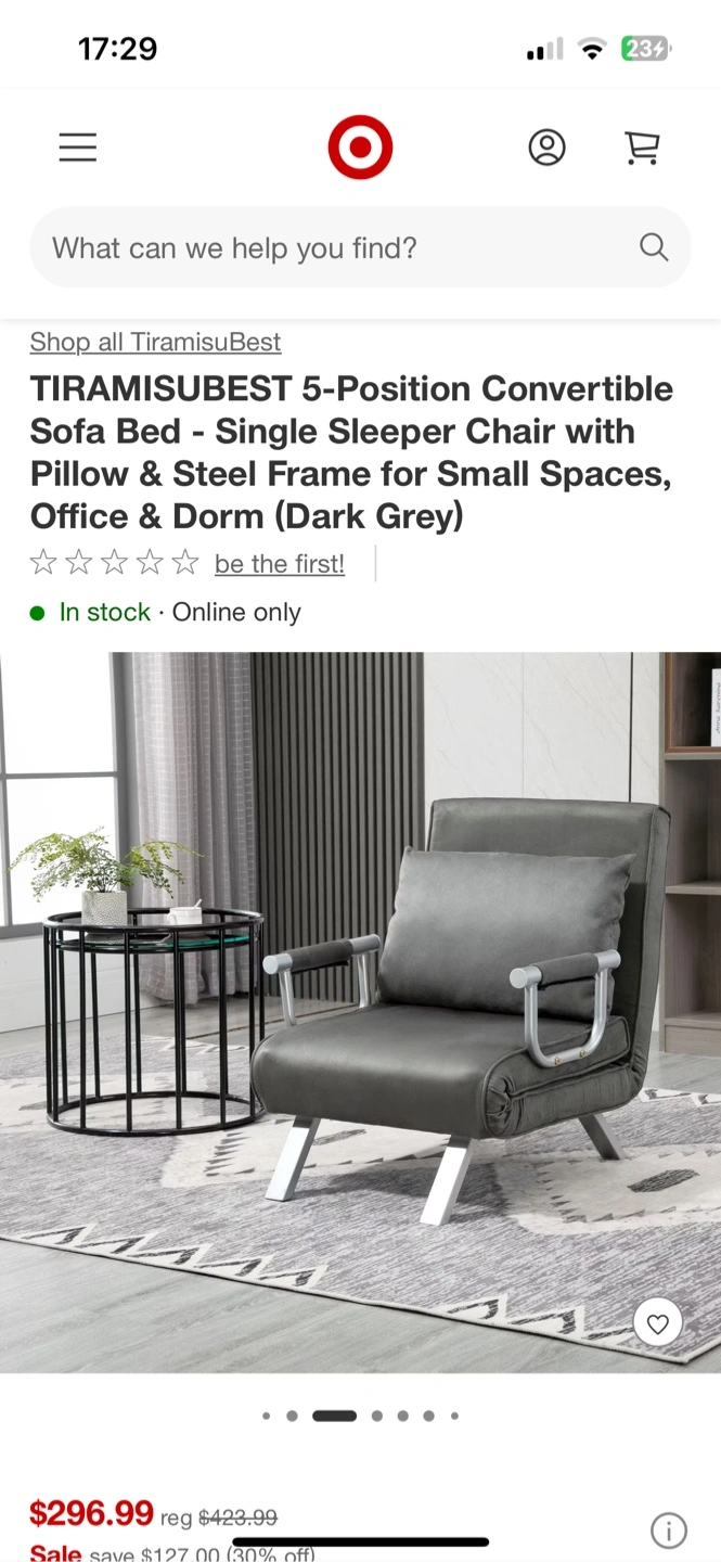 This is a TiramisuBest 5-Position Convertible Sofa Bed. It can be used as a sofa, cozy sofa bed, or single bed. Perfect for small spaces, offices, and dorms. The frame is made of steel and it comes with a pillow.