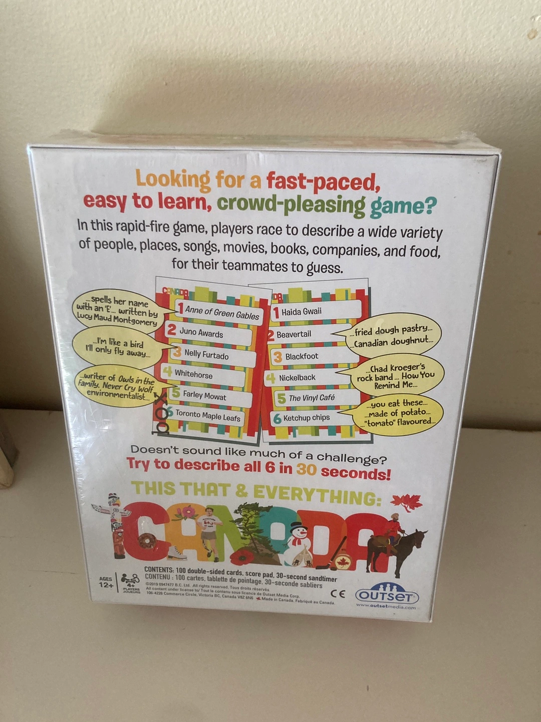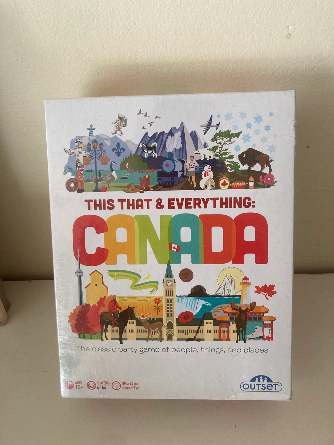 Selling a brand new, still-in-shrink-wrap copy of This That & Everything: Canada board game! It's the classic party game of people, things, and places in Canada. Perfect for family game night or a get-together with friends. The game includes 100 double-sided cards and a score pad, plus a 30-second sand timer for added fun The bottom plastic is bit peeled. (Please check the photo) Pick up from Regent park - Corktown Area. Can be Scarborough (Weekend) or Dufferin Grove Park (Thu), can be nightingale. :)