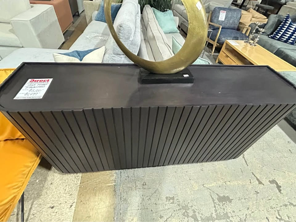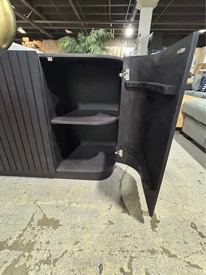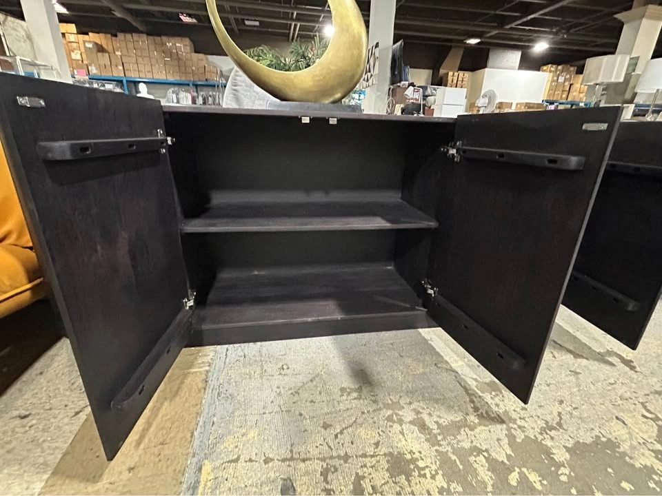 BRAND NEW: Moe's JD-1050-02 Povera 4 Door Sideboard in Black Acacia Wood. Regular retail $3199 + tax, but I'm selling for $1100 and zero tax. This piece anchors the dining room with its Acacia facade's gentle ribbing reminiscent of ripples and waves adding texture and warmth. A deep, elegant, dark finish allows the natural wood grain to show through. Features: • Handmade of solid Acacia wood with a black, semi gloss finish • The back side is made from engineered wood, which is dent, crack, heat, fade & scratch-resistant • 4 doors with magnetic door catches & 3 adjustable interior shelves * Size — 72W x 18D x 32H * Interior Shelf: 17.25"W x 15.5"D x 13.25"H * Weight 166 lbs