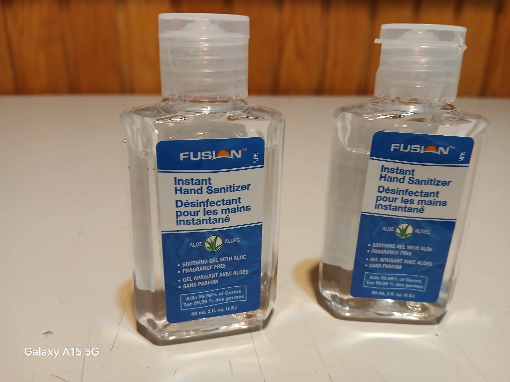 I'm selling two bottles of Fusion instant hand sanitizer. They're the perfect size to keep in your bag or car! They contain aloe, are fragrance-free, and kill 99.99% of germs. Each bottle contains 60ml (2 fl oz)