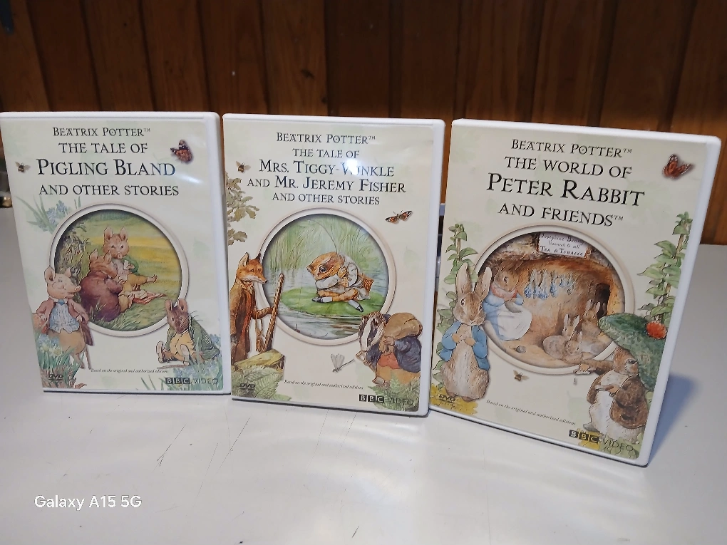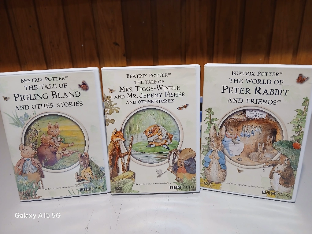 Selling a set of three Beatrix Potter DVDs! Includes: - The Tale of Pigling Bland and Other Stories - The Tale of Mrs. Tiggy-Winkle and Mr. Jeremy Fisher - The World of Peter Rabbit and Friends Perfect for kids and fans of the classic stories