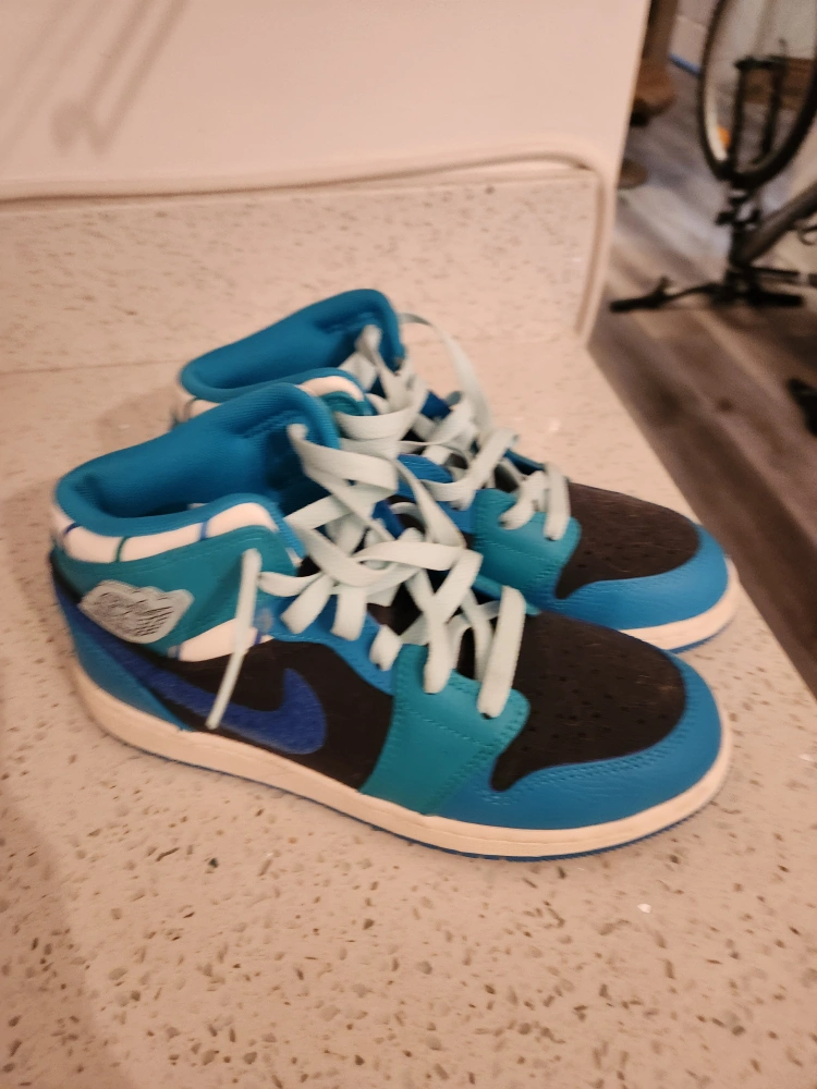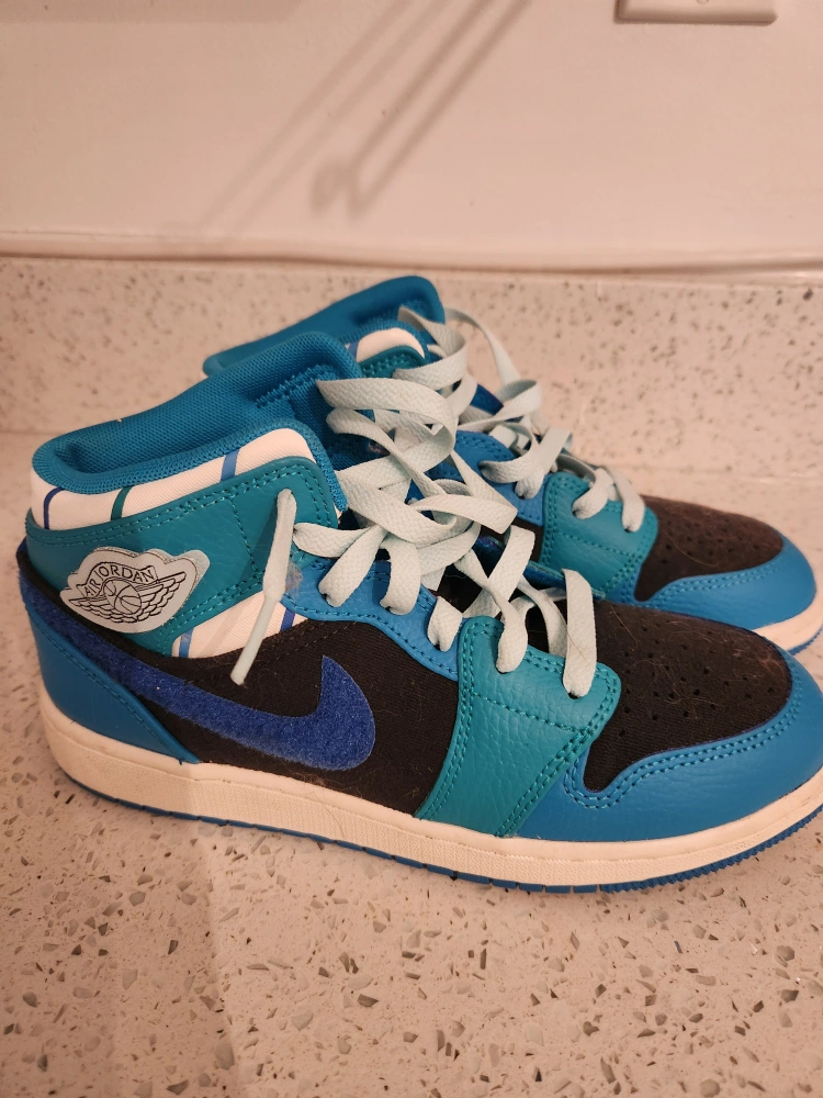 These Air Jordan 1 Mid sneakers are in great shape! They feature a cool blue and black colourway and are a youth size 5. Perfect for everyday wear or hitting the court!