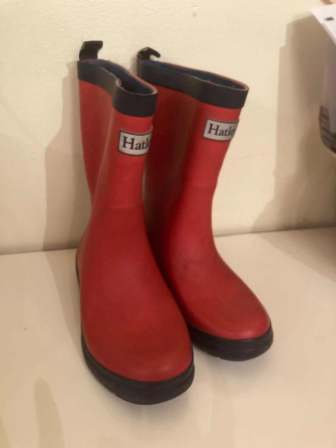 Are you looking for a real rubber rain boots with 100% cotton lining? Here are some cute red rain boots from Hatley! They are in okay condition and ready for some puddle jumping. The size is US 12. Pick up from Regent park - Corktown Area. Can be Scarborough (Weekend) or Dufferin Grove Park (Thu), can be nightingale. :)