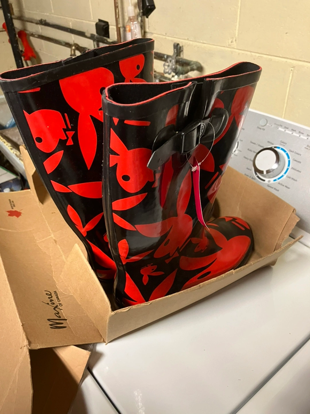 Selling a pair of Maxine of Canada rain boots! They feature a fun red and black pattern. Size 10. Comes with the original box Authentic with tags!