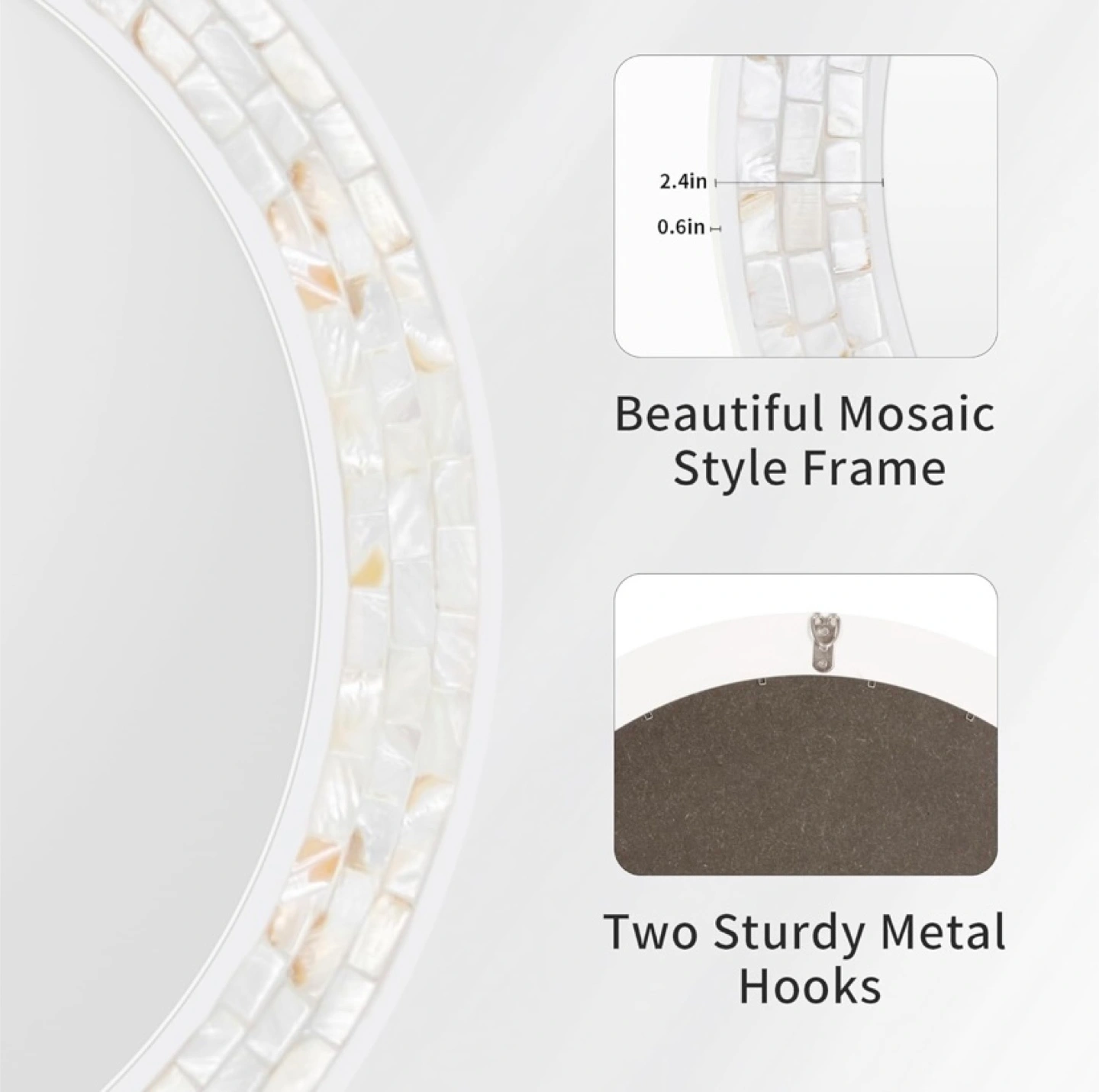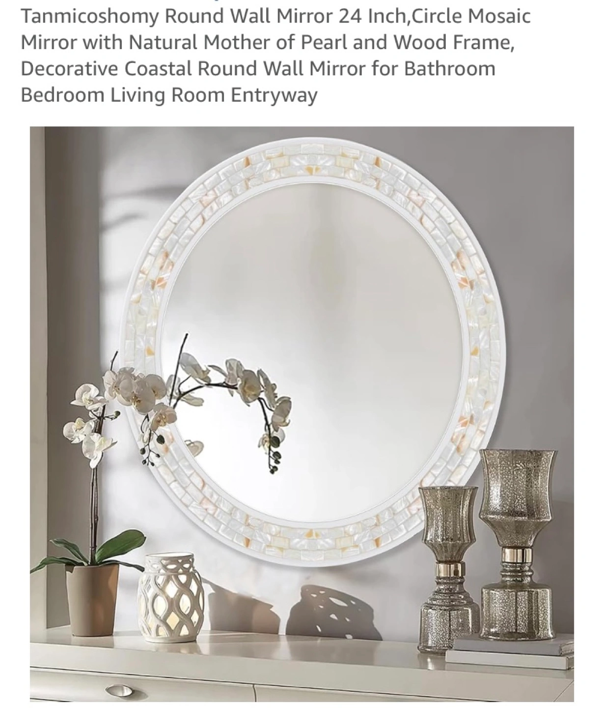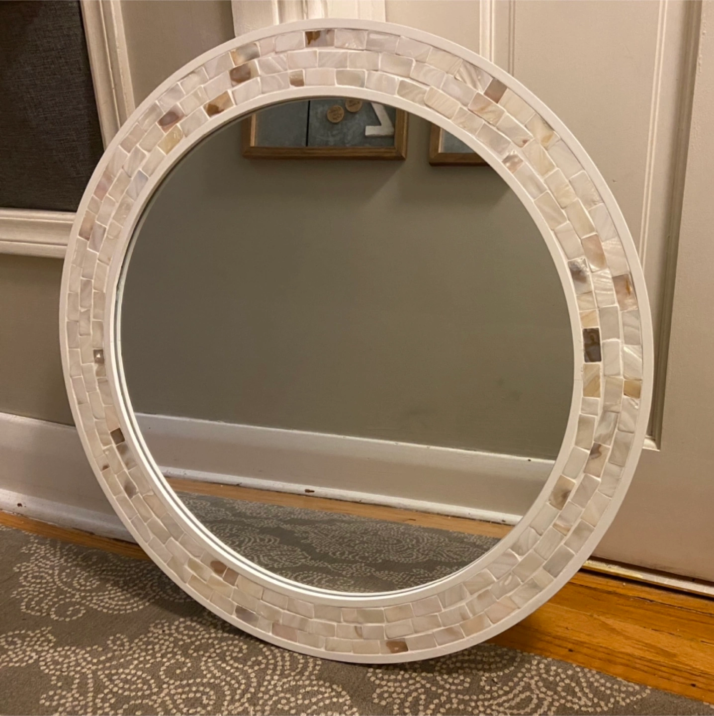 New 24” Circle Mosaic Natural Mother of Pearl and Wood Mirror Small haze spot in mirror. I tried to show in a picture but, hard to see. Have to look at just the right angle to notice it. Reflected in price. $60 (retail $166 plus tax) Pickup in Whitby