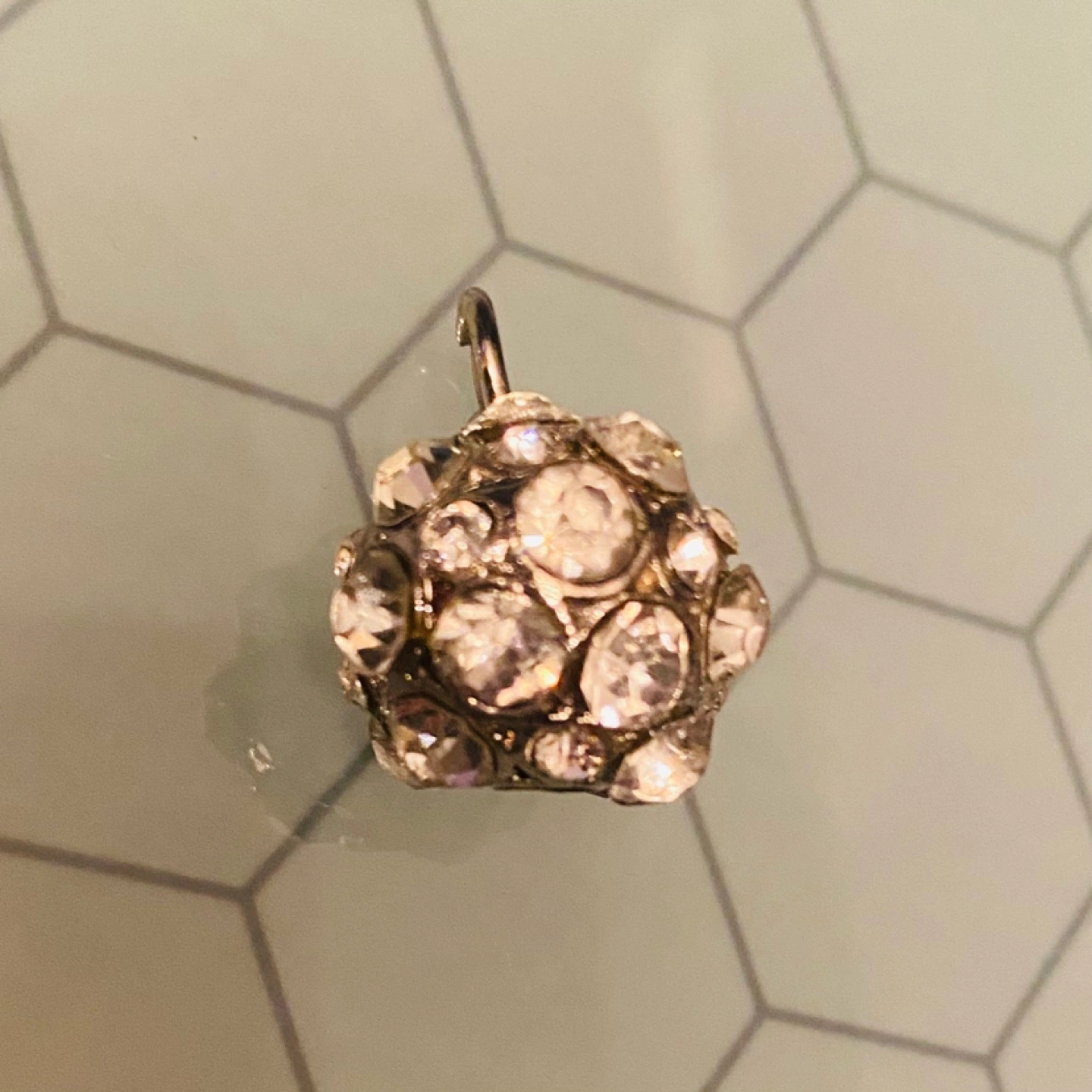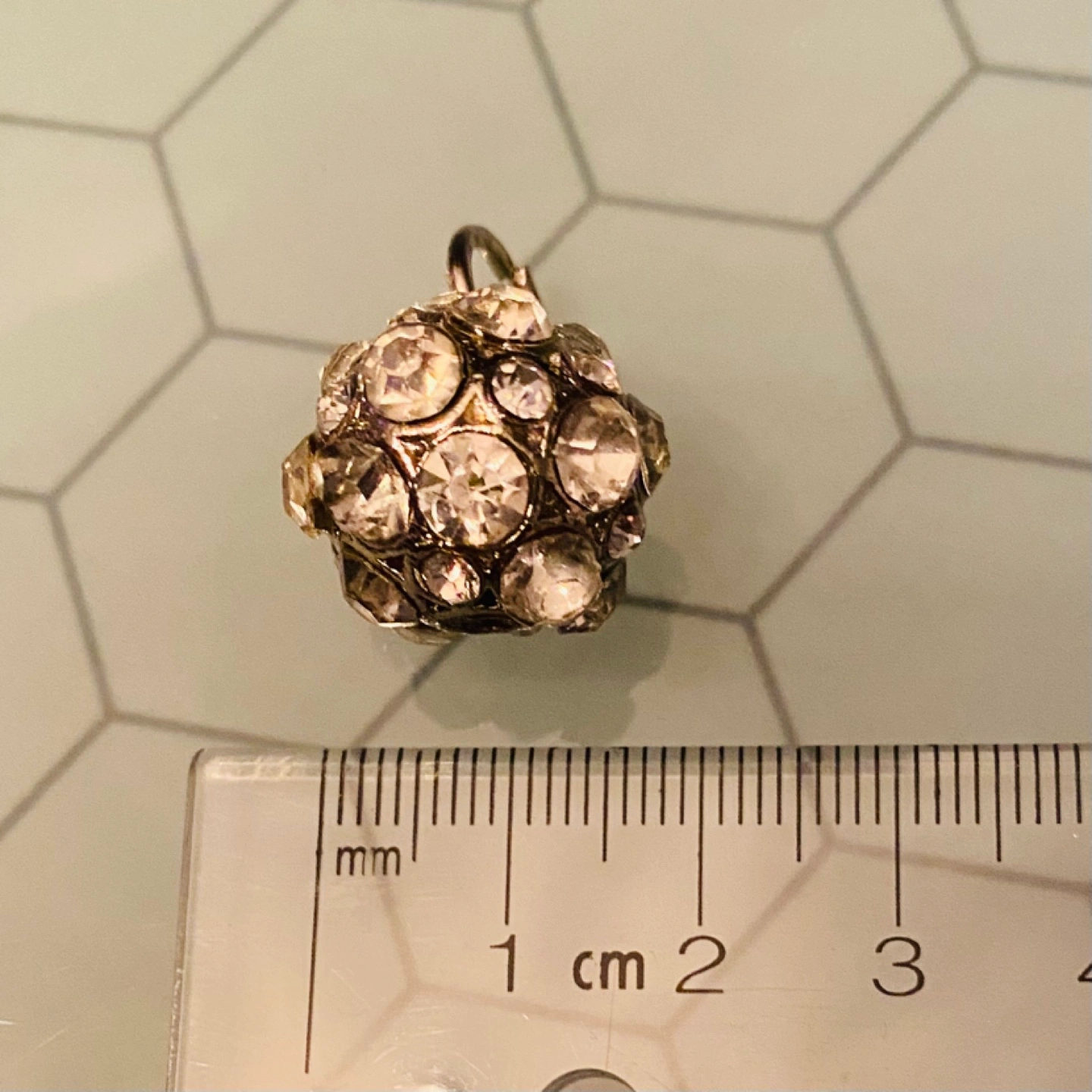 This is a very sparkly rhinestone ball pendant. It measures almost 2 cm in diameter. It would be perfect for a bag charm, necklace or bracelet! *Note - it has one stone missing. #freecycle