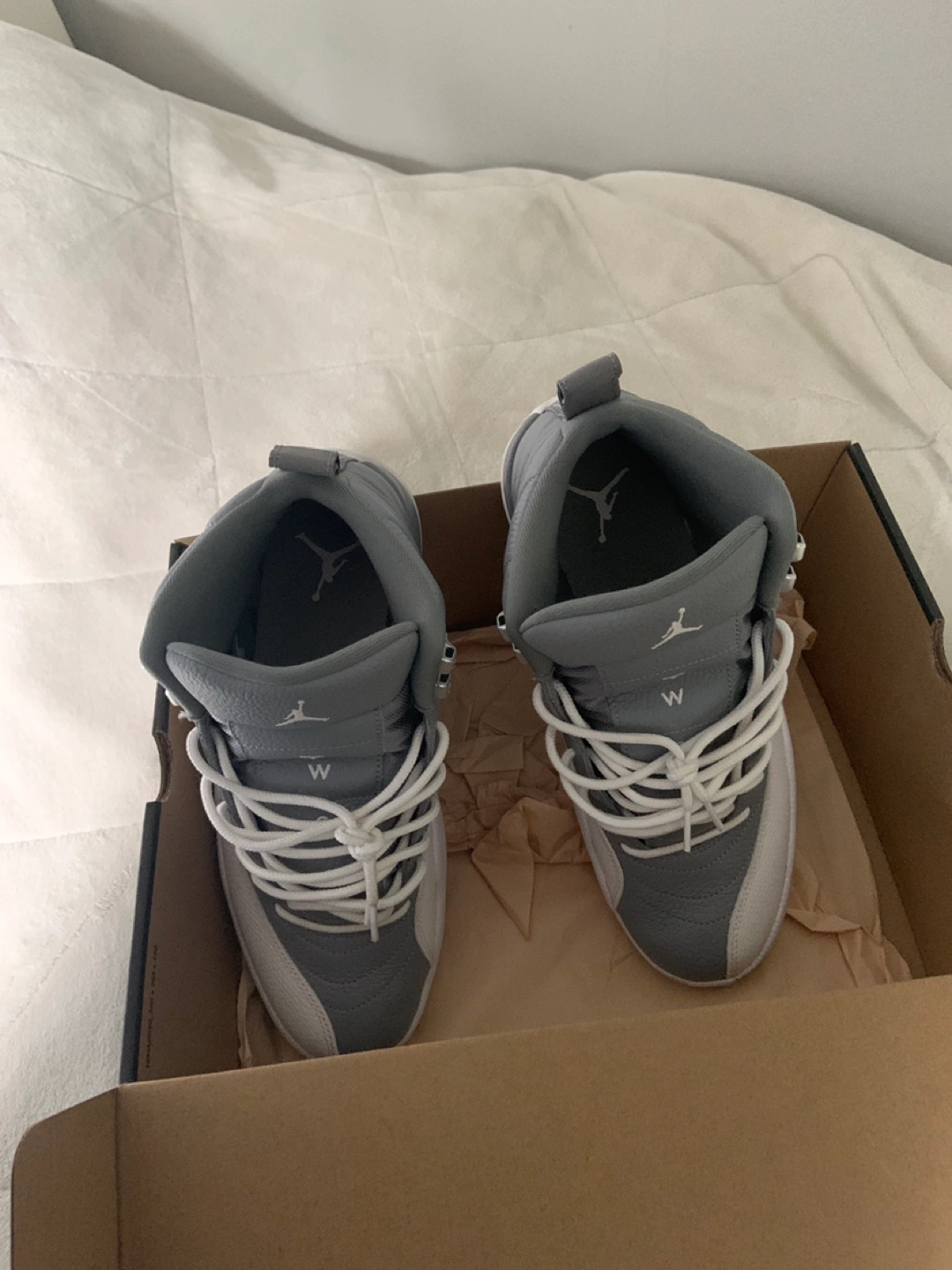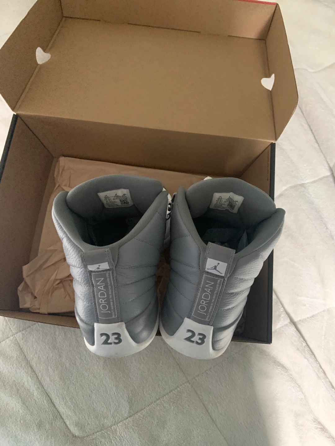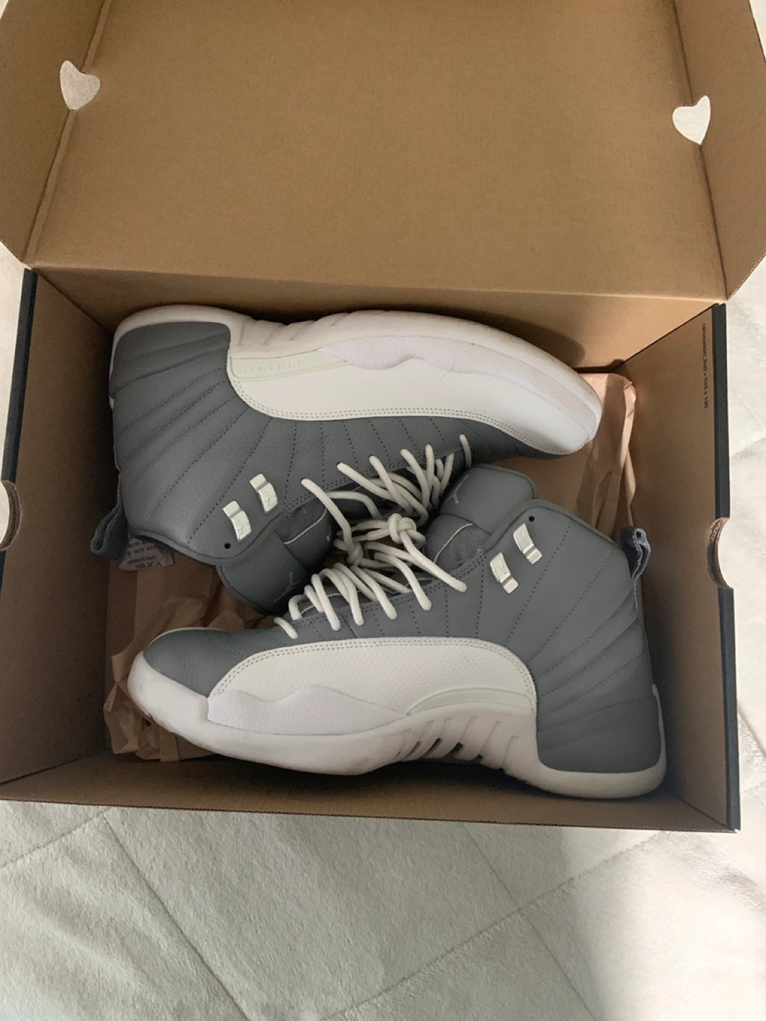 Selling a pair of Jordan 12 Retro sneakers in grey and white. They are in great condition and come with the original box!