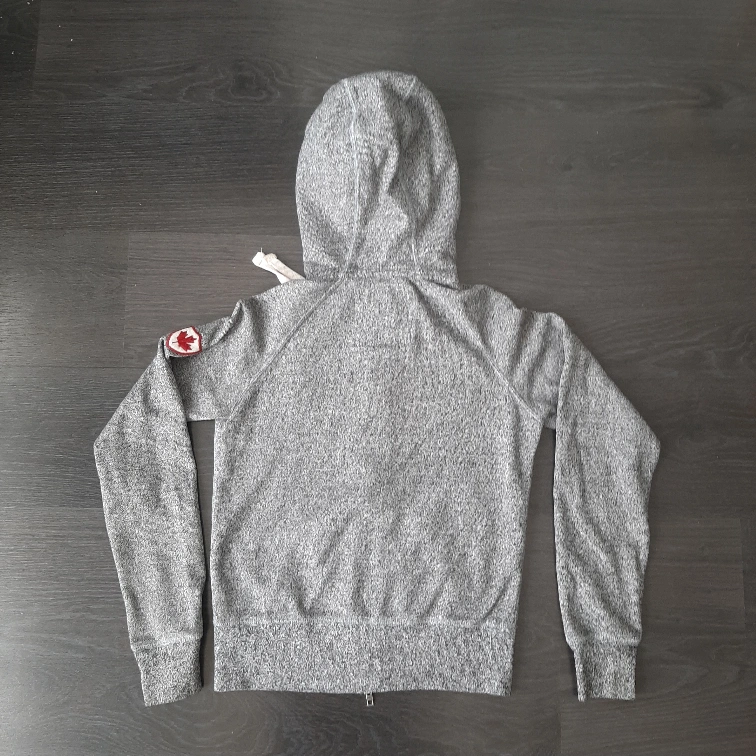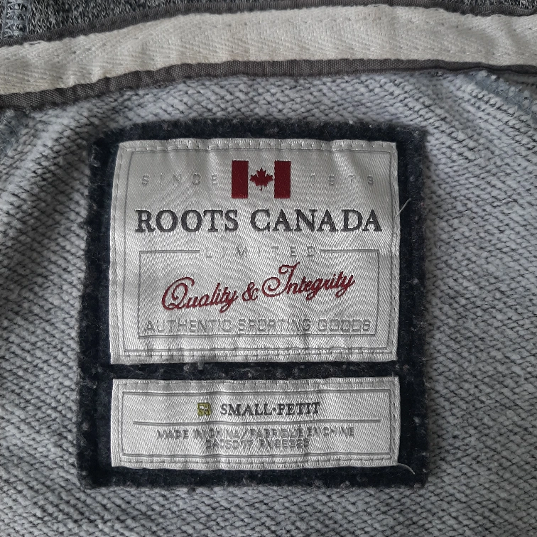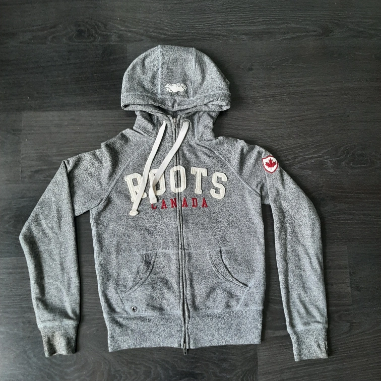 Roots Canada grey hoodie in size small. It features the classic Roots logo across the chest and a Canadian flag on the sleeve. Perfect for staying cozy!