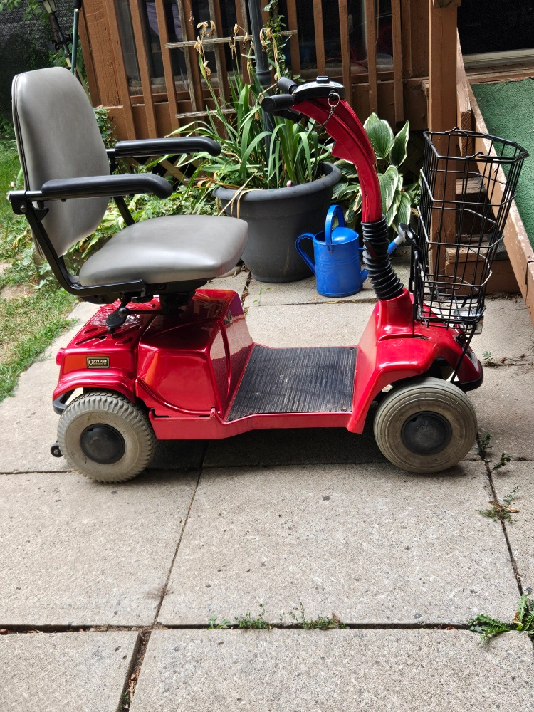 Selling a red fortress Optima mobility scooter with key and charger. It comes with a basket and a comfortable seat. The scooter also has a battery indicator that is fully charged.so you can keep track of the charge level. seat moves sideways so you can get in and out easy.come test drive today. 401 and islington ave area. can deliver for a fee depending where.