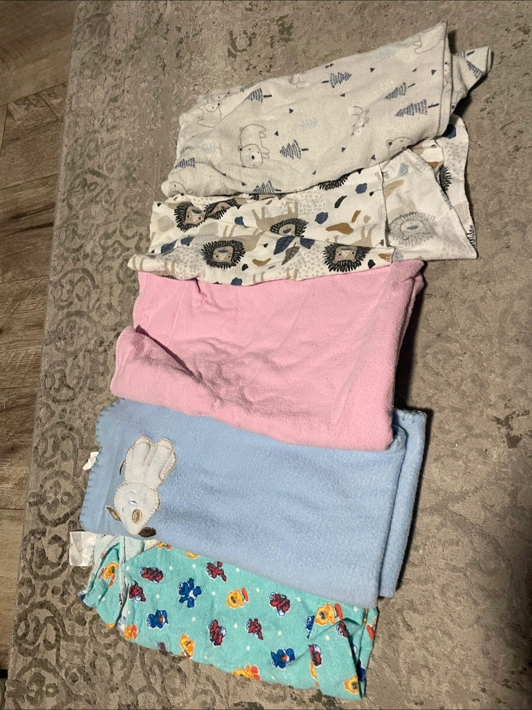 Selling a stack of baby blankets in various patterns and colours! These blankets are soft and perfect for keeping your little one cozy. They feature cute designs like bears, trees, lions, and other fun characters. Great for swaddling, tummy time, or just cuddling up