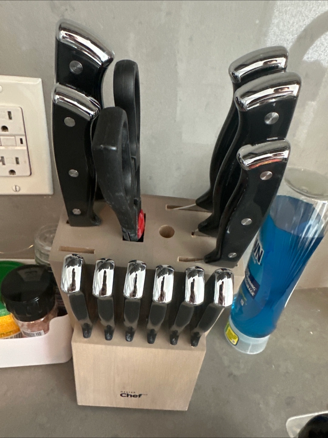 Selling a Master Chef knife set with a wooden block. The set appears to include various knives and a pair of scissors. Great for any kitchen!
