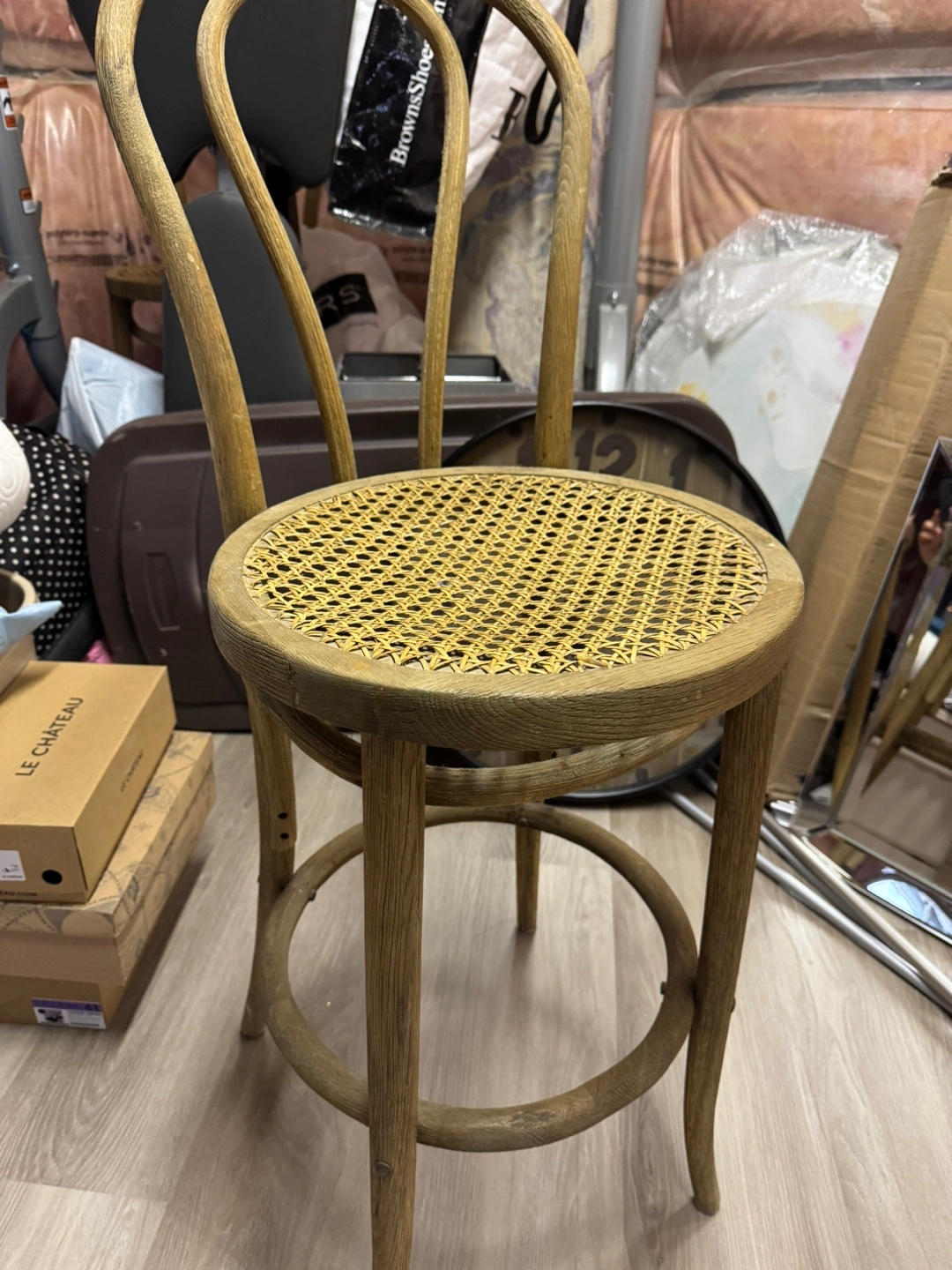 Selling three charming bentwood bar stools with a rattan seat! It's in great shape and would add a touch of vintage style to any kitchen or bar area. The wood has a lovely warm tone, and the rattan seat is both comfortable and stylish 26 inches from the floor to the seat